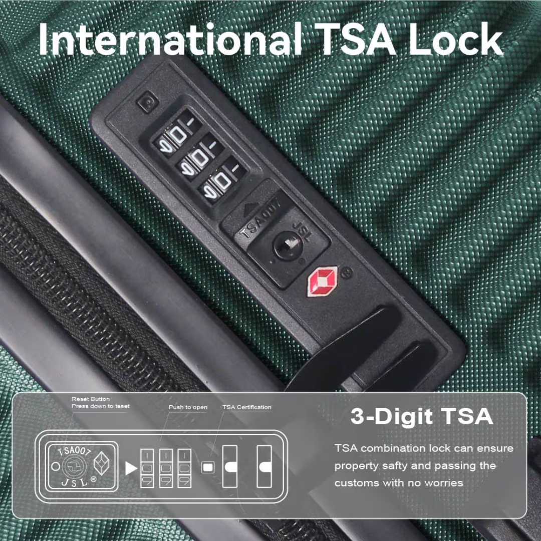 TSA-Approved Lock: The TSA-approved lock ensures your luggage remains secure and prevents forced inspections during customs checks, protecting your privacy and belongings.