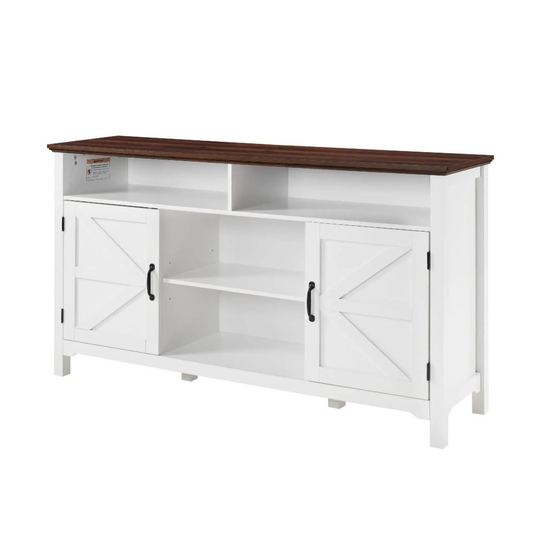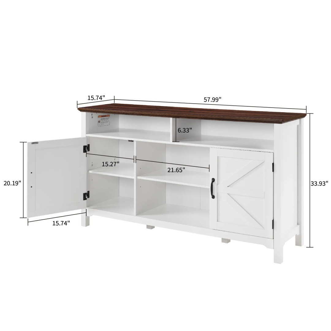 【Timeless Farmhouse Elegance】: Measuring 58" L x 15.7" W x 33.9" H, this farmhouse buffet cabinet features a rustic antique white finish with walnut wood grain accents. The classic iron-tone metal hardware and hinged barn doors give it a charming, rustic appeal that enhances any living room, dining room, or entryway décor.