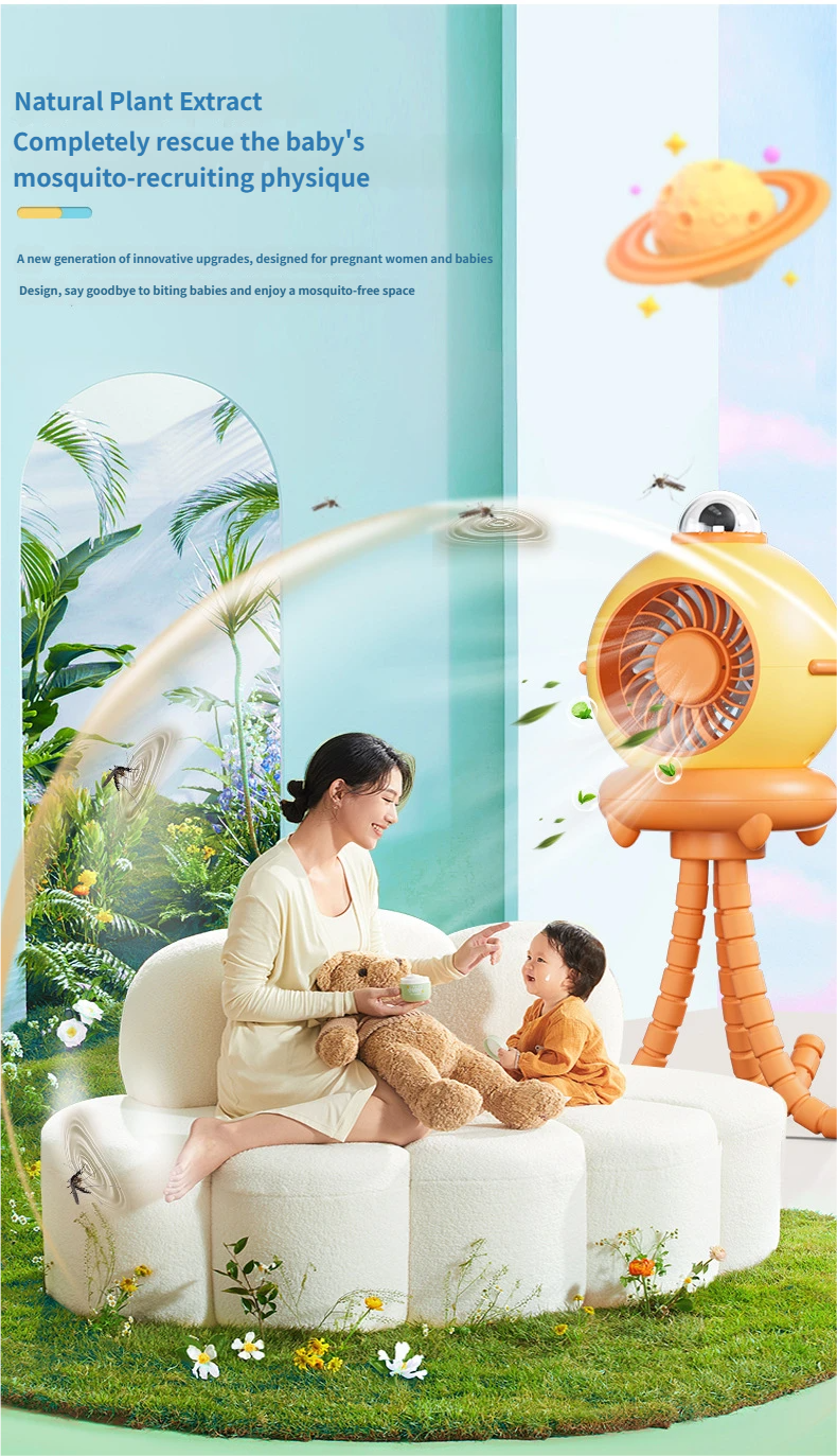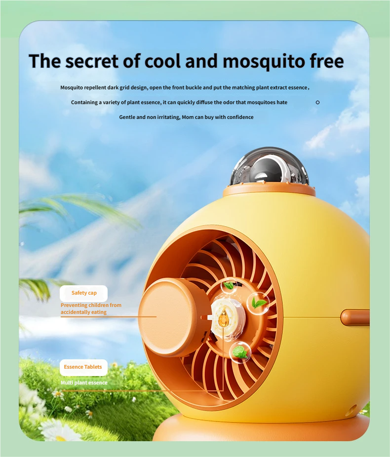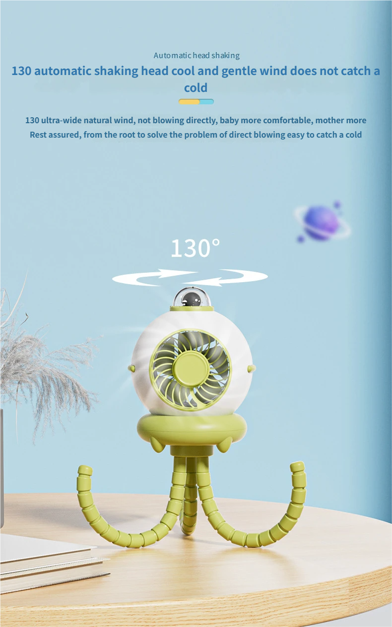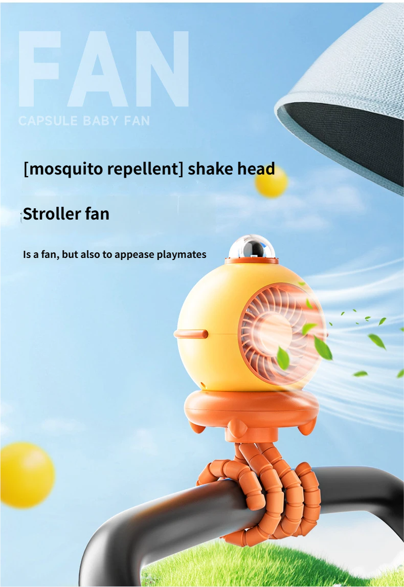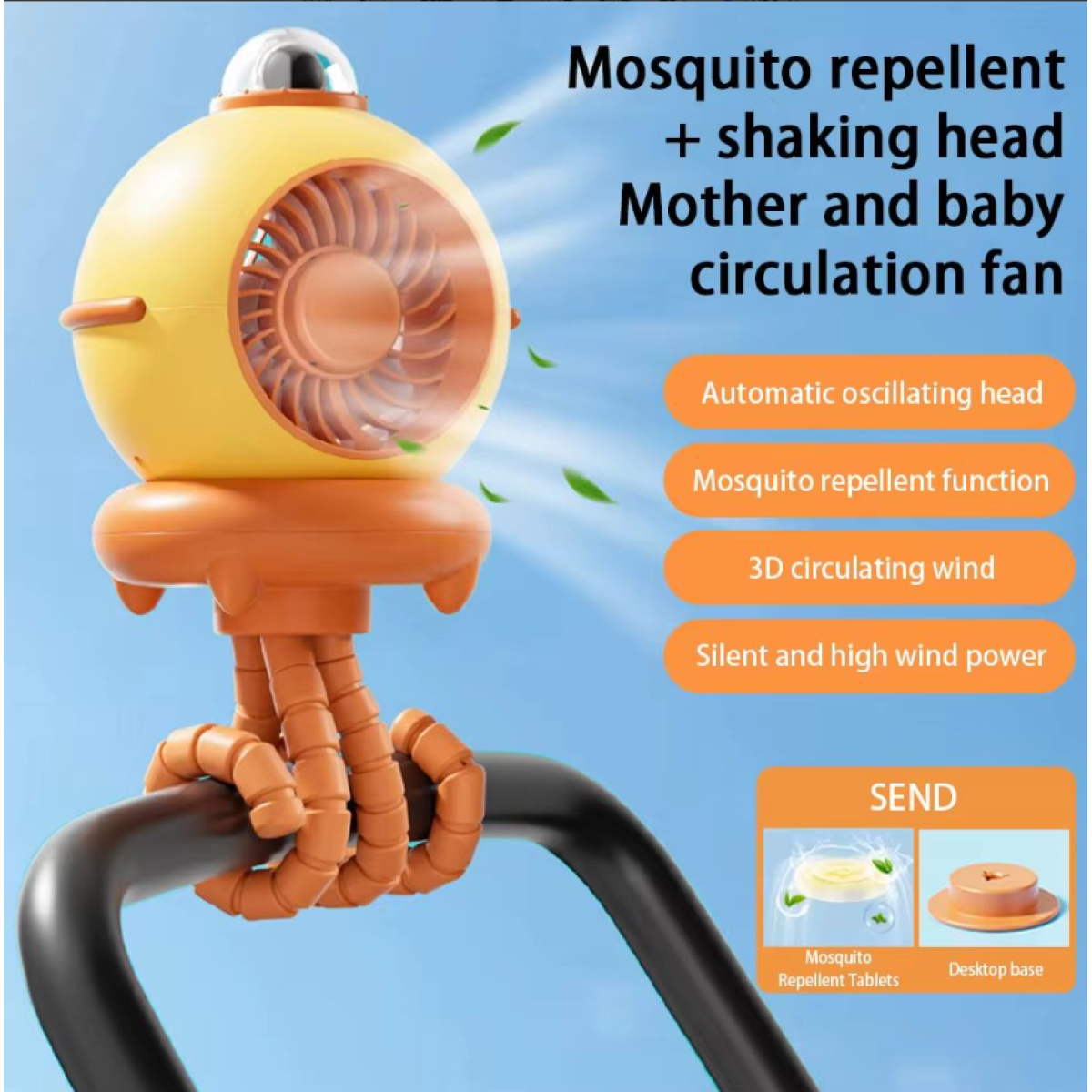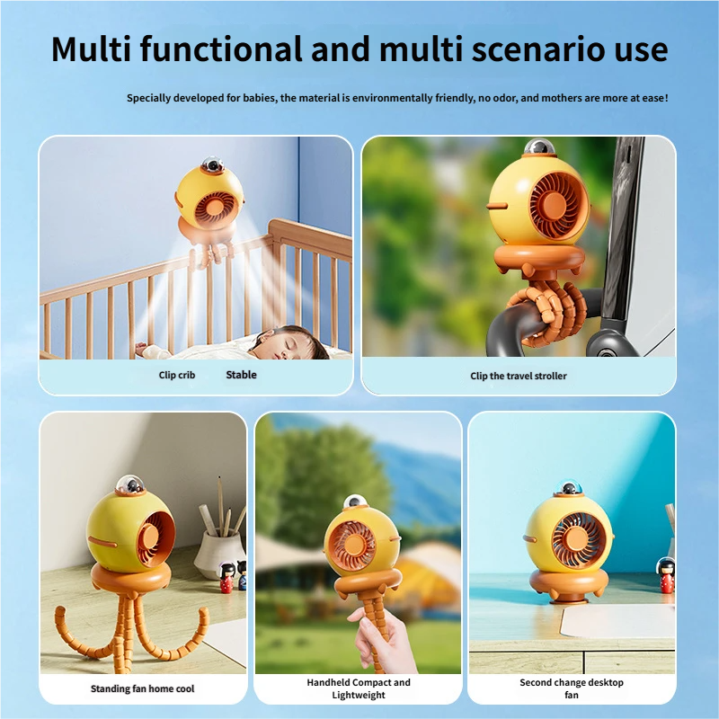 This yellow octopus flexible fan is a versatile and portable cooling solution designed for multi-scenario use, featuring a flexible octopus-shaped body that can be wrapped, fixed or placed freely on desks, beds, strollers and more. Equipped with a built-in rechargeable lithium battery, it supports cordless use with a 3-6 hours long battery life, meeting your on-the-go cooling needs. With 4 adjustable wind speeds, ultra-low noise (≤36dB) and a high-performance brushless motor, it delivers quiet and efficient cooling. What’s more, it adds practical shaking head and mosquito repellent functions, combining cooling, comfort and pest prevention in one, making it an ideal daily companion for home, office, outdoor and baby care.