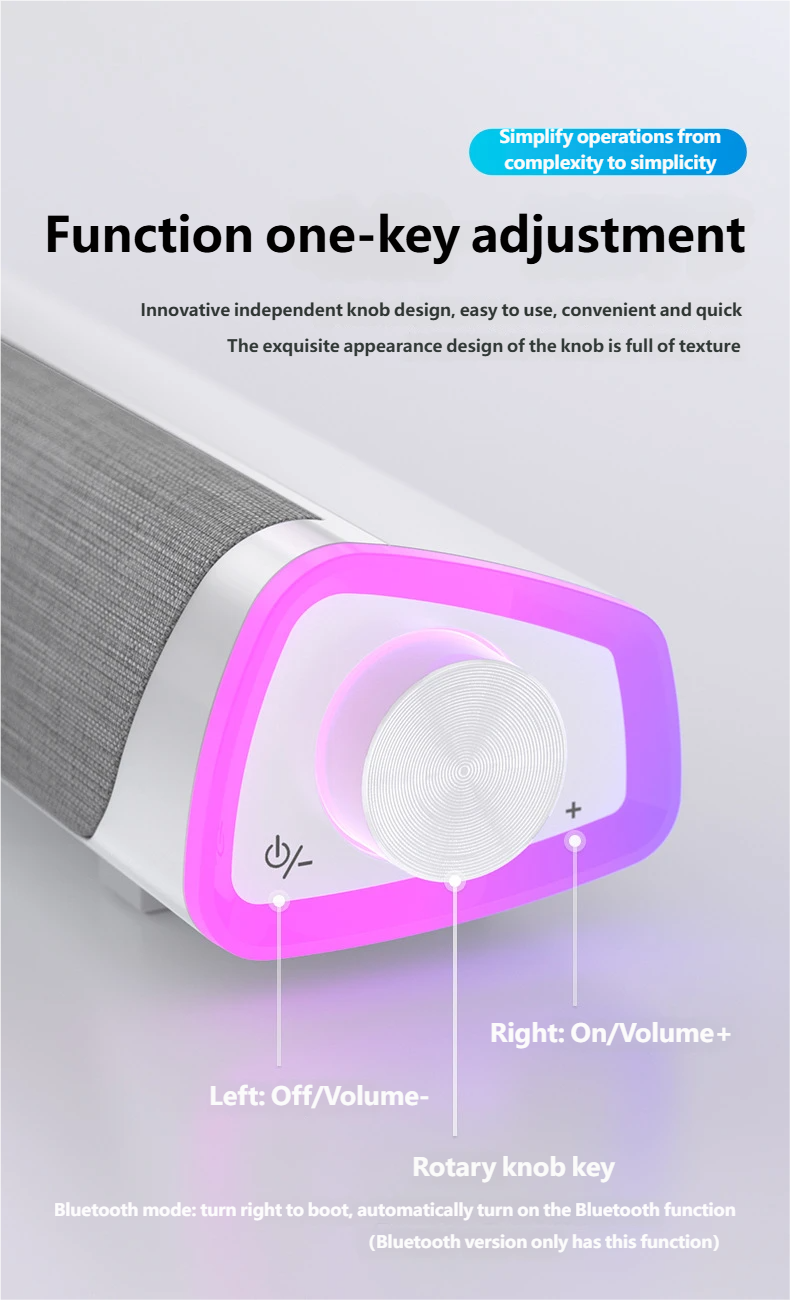 Features an innovative independent knob design integrating power switch and volume control. Rotate left to power off/decrease volume, rotate right to power on/increase volume. The simple logic and metallic knob provide excellent tactile feedback.