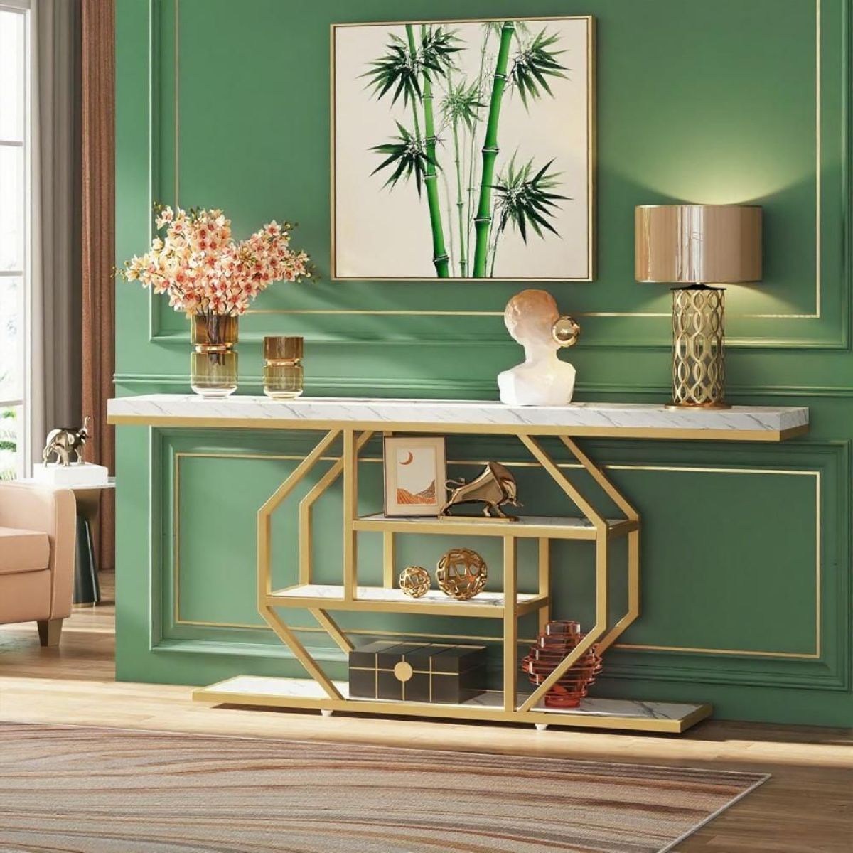 [Time for a New Console]Looking for a wonderful sofa table? Offer gorgeous style and storage all wrapped up in one with our gold console table. Defined by a faux marble veneer top with realistic-textured while sitting on an openwork frame base, this modern entryway table will set the tone in your home. Welcome the console into your home today!