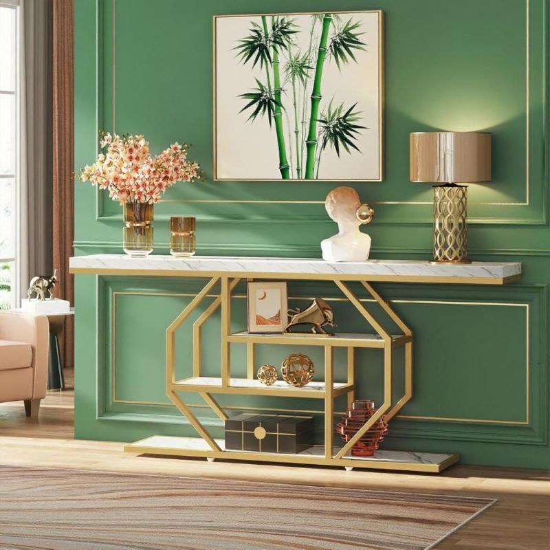 [ Set Up A Proudly Display]Our gold sofa table with a 70.9" extra-long tabletop welcomes any guest with beautiful flowers, your favorite photos, and other trinkets. And three staggered lower shelves perfectly show everything from decorative items and knick-knacks to books or fabric bins. Go ahead and fill it up with decor—it has you covered!