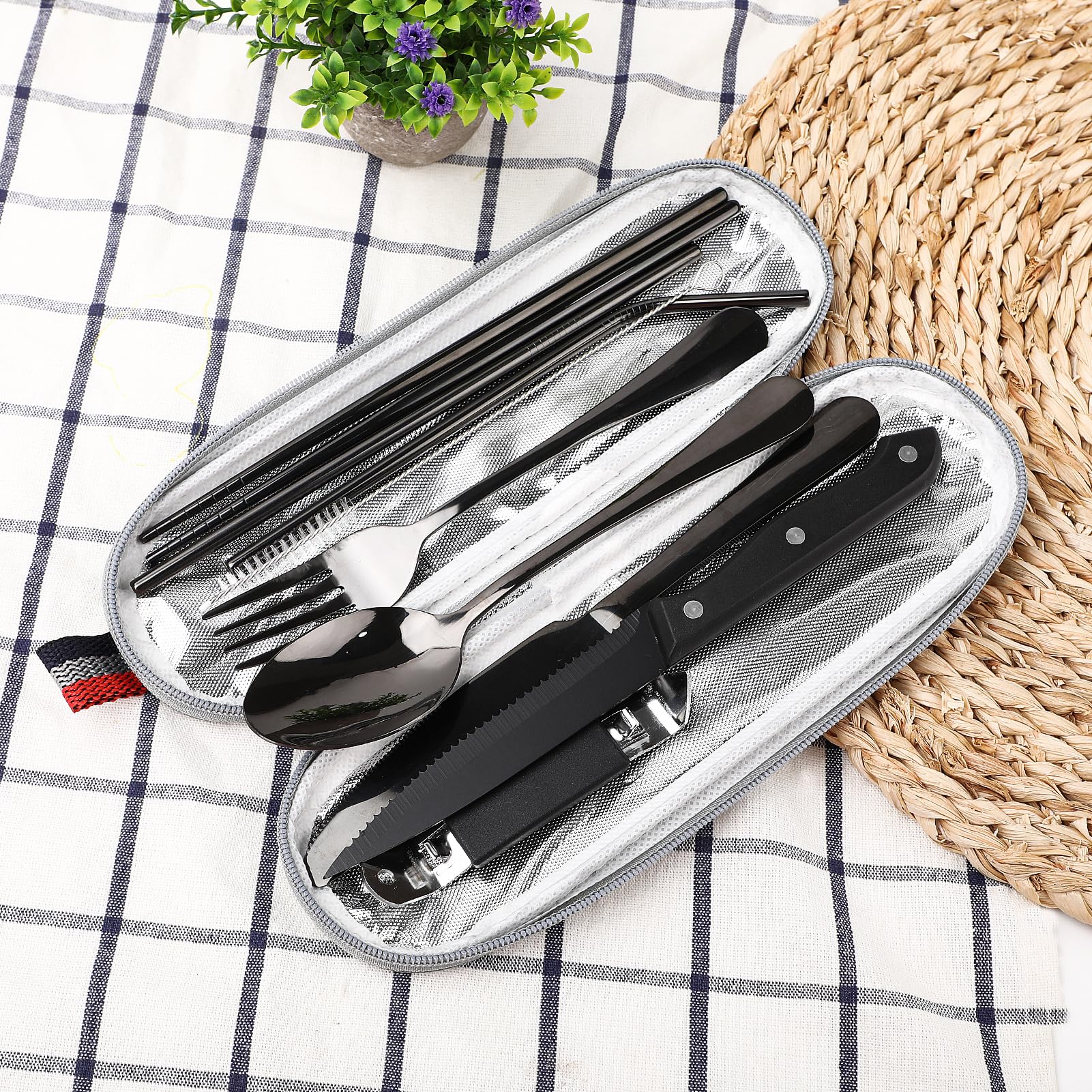 【Camping Cutlery Set】Includes 1 pair of chopsticks, 1 fork, 1 spoon, 1 steak knife, 1 bread knife, 1 bottle opener, 1 straight straw, 1 bent straw, and 1 straw cleaning brush.
