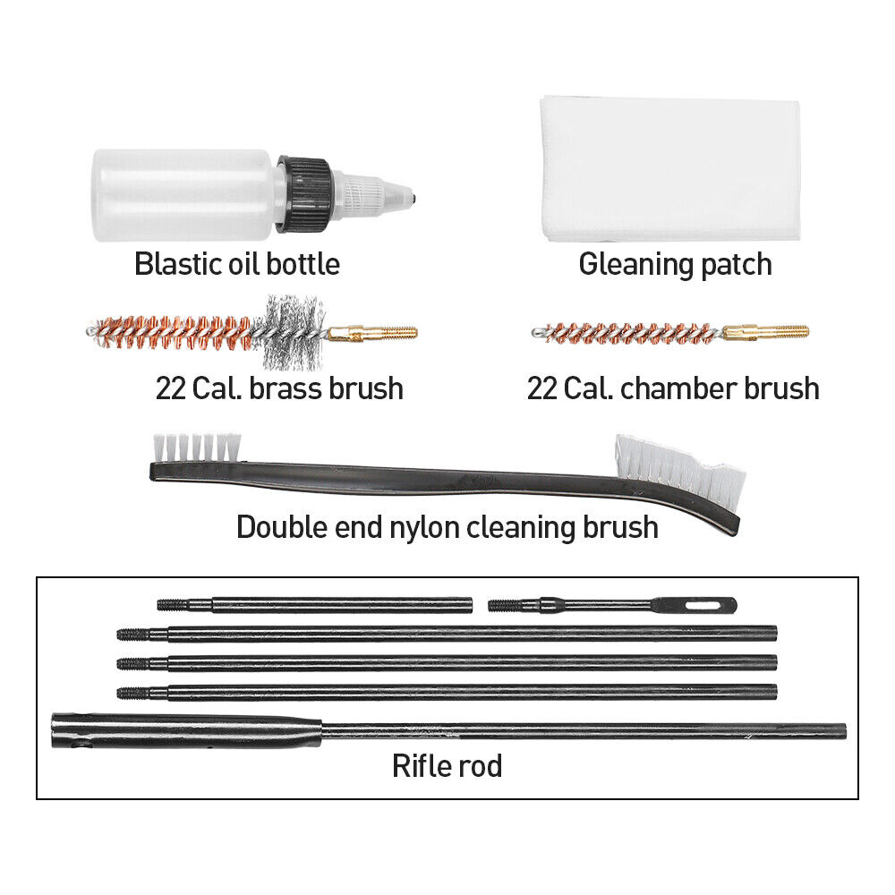 *Cleaning Kit with 5 Piece Rods(Includes Loop), Adaptor, Bronze Bore Brush, Chamber Brush, Dual-Ended Nylon Brush, Oil Bottle and Cleaning Cloth