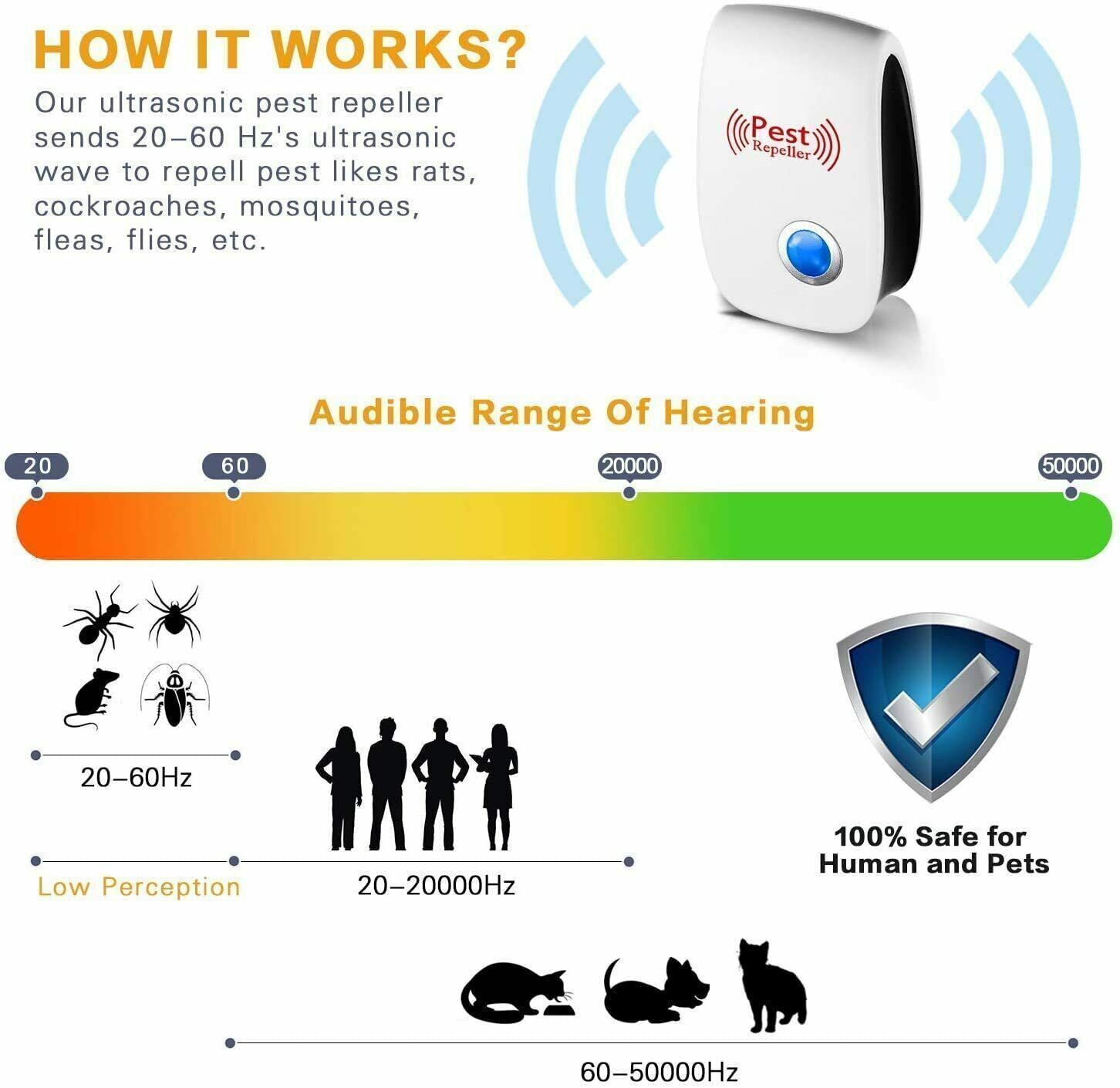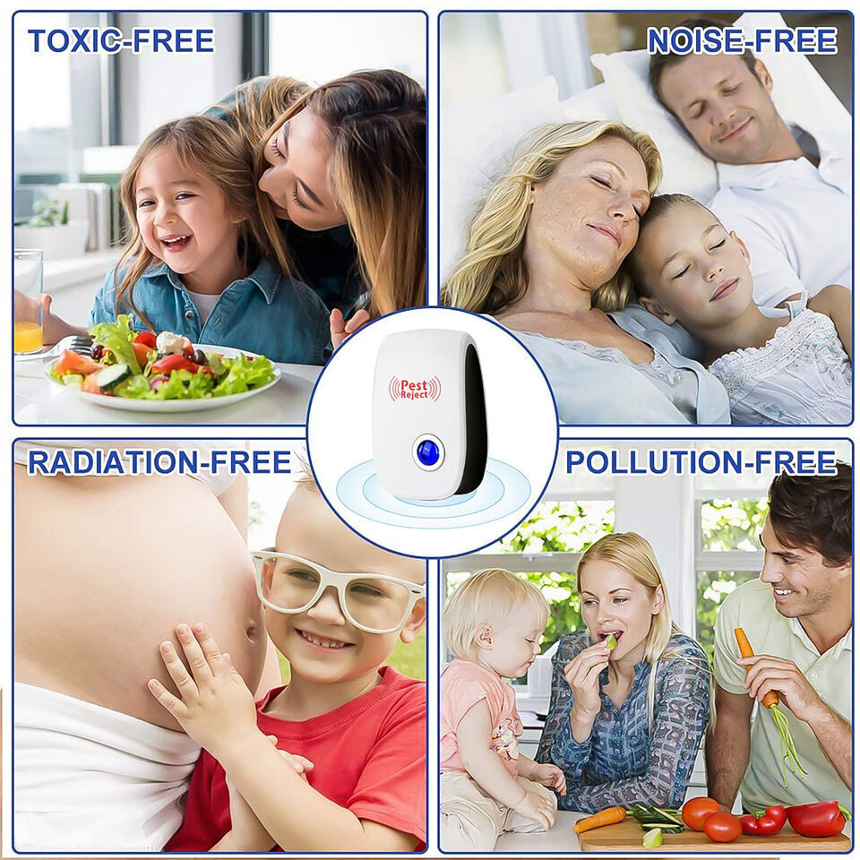 Non-toxic and Harmless:The ultrasonic insect repeller uses an intelligent technology that repels insects with dual sound waves, i.e., ultrasonic and electromagnetic wave frequencies. The repellents emit ultrasonic waves of different frequencies to stimulate the pests' nervous system and make them feel uncomfortable, thus driving them away. These waves are non-toxic and harmless to the human body, and can be used by children and pregnant women.