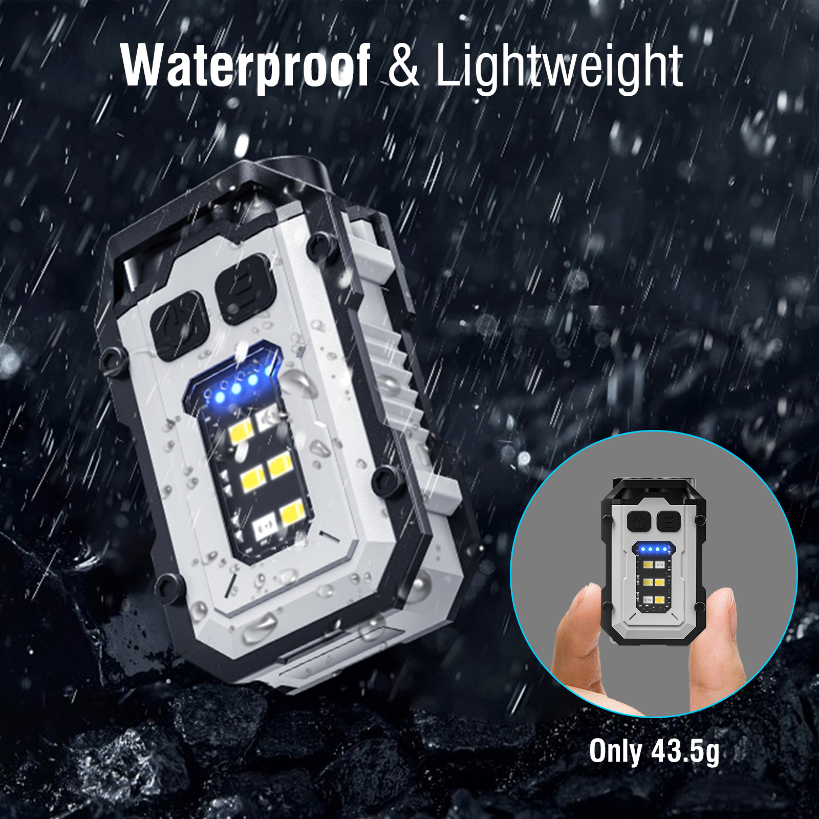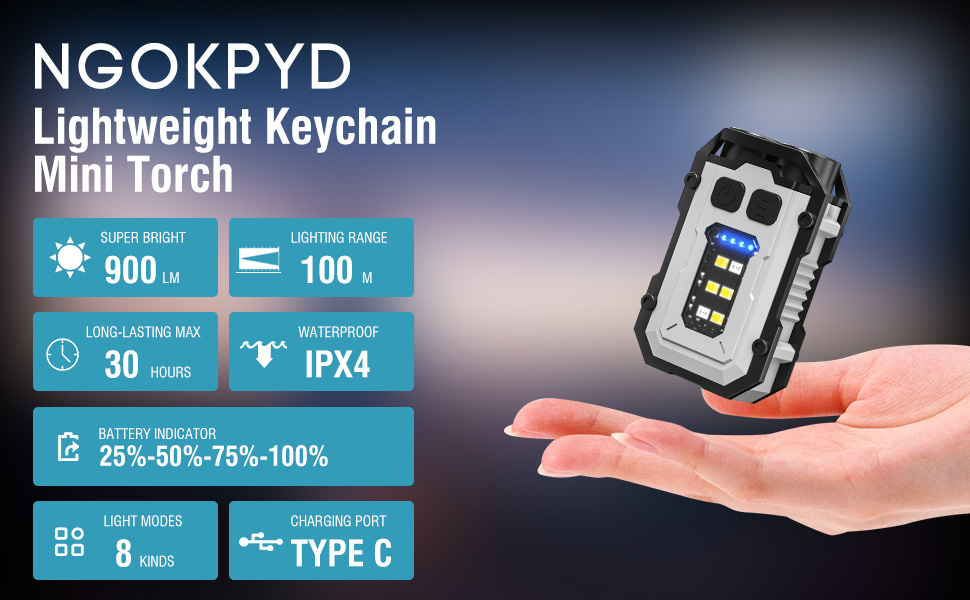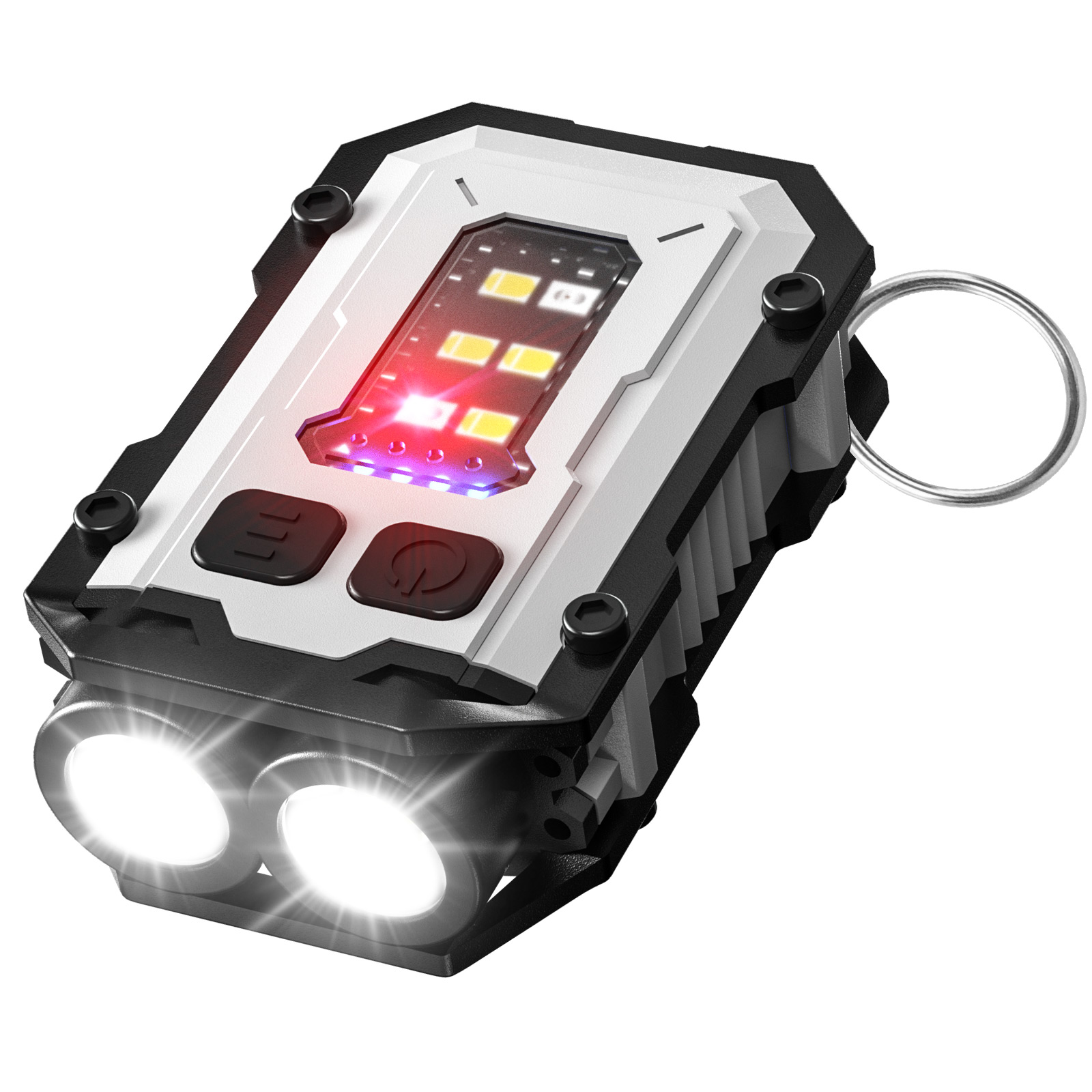 Product Name SKU: Type-C Rechargeable High-Brightness Mini Steel Cannon Keychain Light - EBW2172 2 Full Set Configuration: 1*Keychain Light, 1*Type-C Charging Cable, 1*Key Ring 3 Does shipment include a packaging box: Box 5 Net Weight (g): 67g 6 Shipping Weight (g): 67g 7 Packaging Box Weight (g): 67g 8 Special Purpose of Product: Lighting 9 Product Material: Aluminum Alloy 10 Appearance Color: White/Black 11 Product Size: 5.7*3.7CM 12 Packaging Box Size: 8*7.7*2.7CM 13 Applicable Packaging SKU: None 14 LED Brand and Model: LED COB 15 Number of LEDs: 2 LEDs, 8 COBs 16 Rated Power: 5W 17 Light Color: White Light 18 Color Temperature: 6500K 19 Switch Position and Method: Button Switch 20 Mode/Working Mode: Dual Light High-Beam - Dual Light Low-Beam - Single Light High-Beam - Single Light Low-Beam - COB Strong Light - COB Weak Light - COB Red Light Constant On - COB Red and Blue Flashing 21 Actual Lumens and Wattage: 500LM 22 Lumens for Different Modes: None 23 Charging Time: About 2-3h 24 Endurance Time for Different Modes: About 3-4H 25 Range: About 100M 26 Battery Model and Parameters: 750mAh Battery 27 Shipped with Power: Yes 28 Rechargeable: Yes 29 Charging Method: Type-C Charging 30 Charger Specifications: None 31 Product Output Voltage and Current: None 32 Charger Input/Output Voltage and Current: No 33 Adjustable Focus: No 34 Waterproof Level: Life Waterproof 35 Diving Depth: None 36 Solar Panel Parameters: None 37 Sensor Principle and Distance: None 38 Sensing Angle: None 39 Certification: None 40 Warranty Period: None 41 Packing Information: None 42 Other Special Operating Instructions: None 43 Highlight Selling Points (Detailed): Product Name: Multi-functional Keychain Light Control Method: Independent Dual Switch Charging Method: Type-C Fast Charging