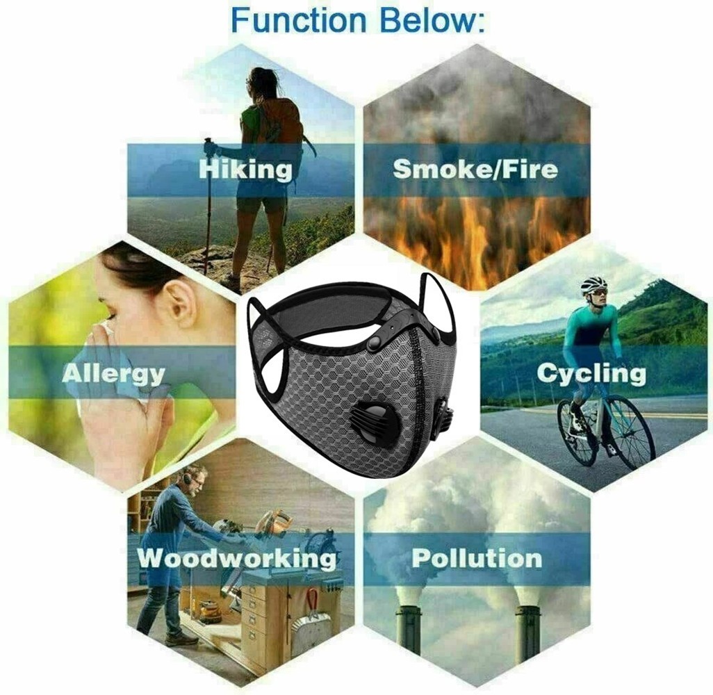 Filter layers: 2x Waterproof nonwoven polypropylene, anti-odor activated carbon, cotton prefilter, and electrostatic meltblown cotton submicron filter.