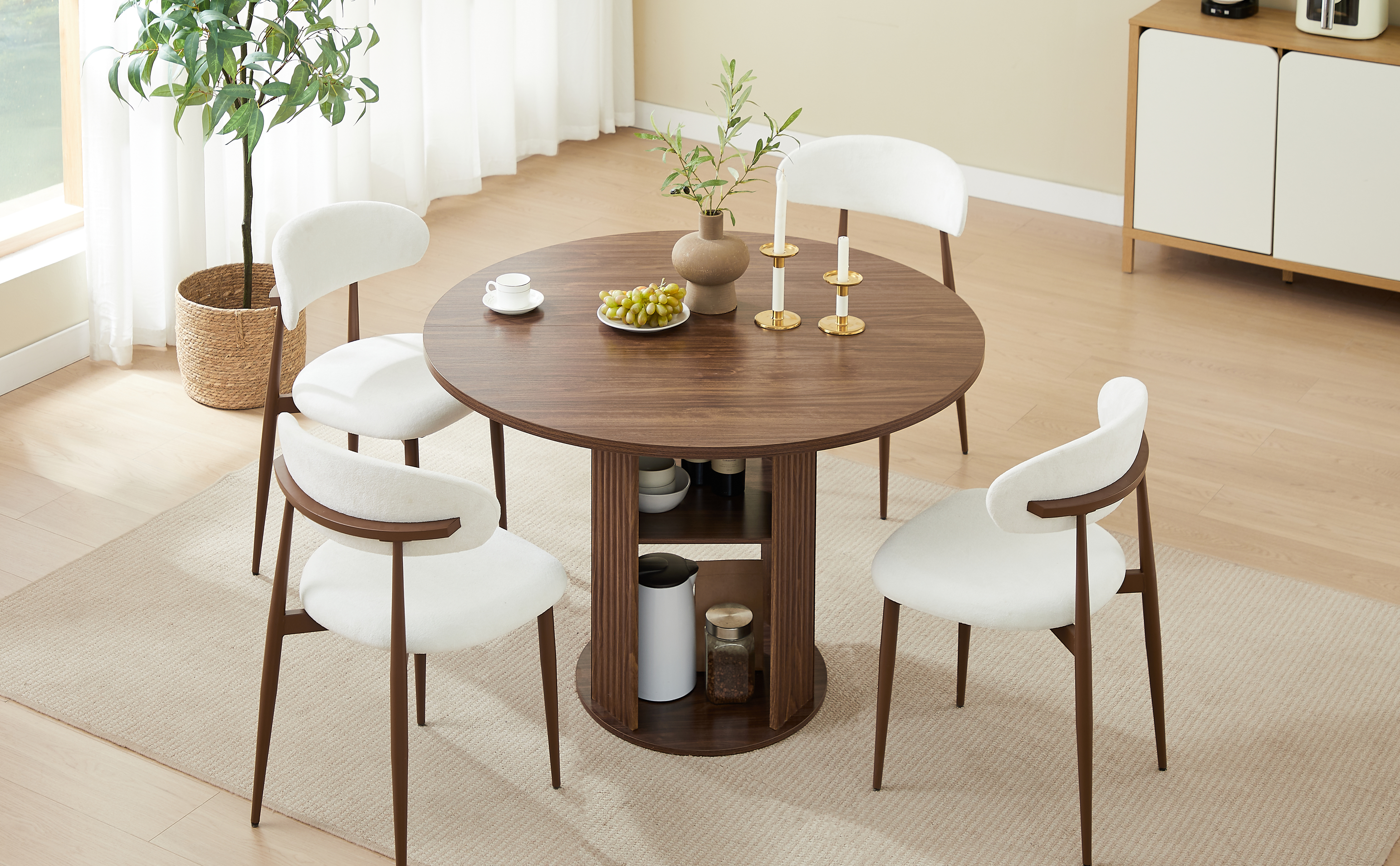 Product Name:47.24" Round Dining Table (Serves 2–4) with Two Dining Chairs Blends modern and farmhouse styles, featuring a double-tiered storage shelf, suitable for dining rooms or living spaces. Walnut