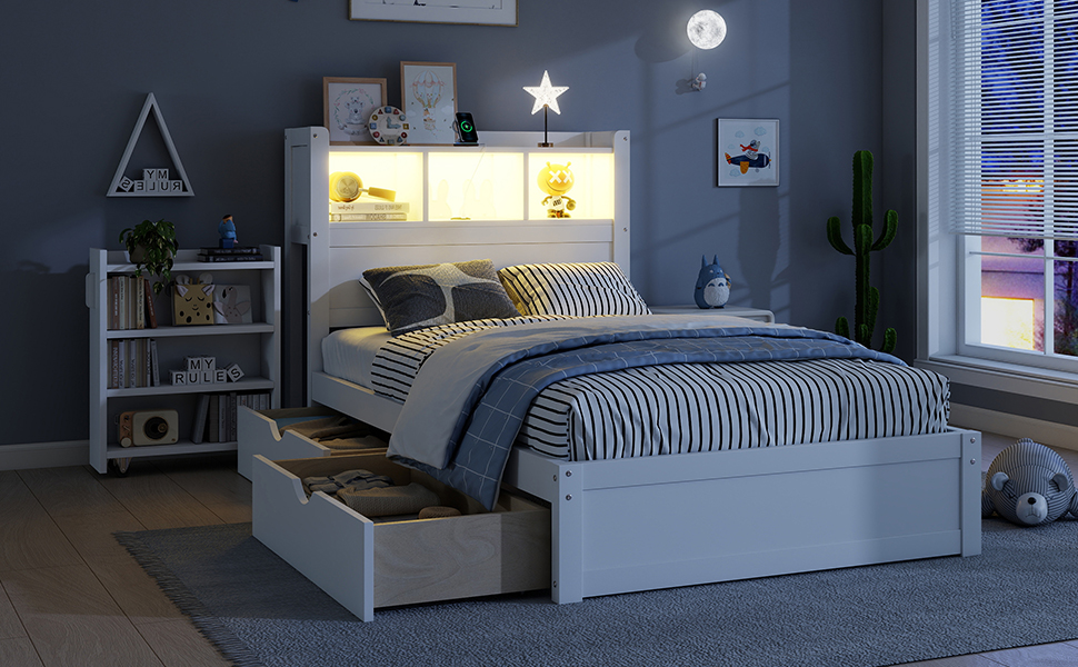 This wood twin bed included the storage shelves on headboard and LED light, also drawers and pull out storage cabinet which save space for your room.