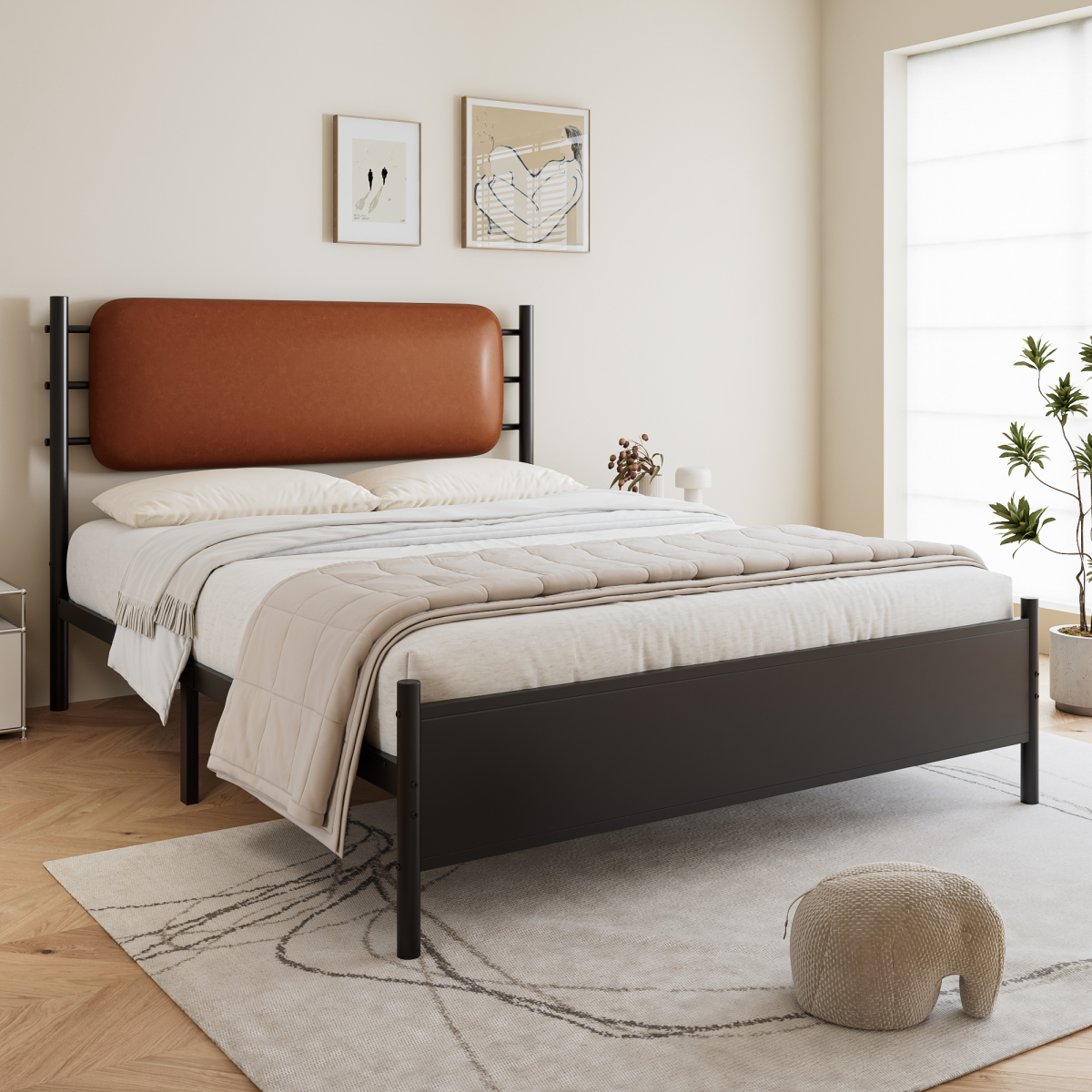 Product Name:Metal bed, 4ft6 double bed 135×190cm, With a PU-upholstered headboard, Durable and Sturdy, Youth bed, for adults & teenagers, Wrought iron bed, Black Iron+PU