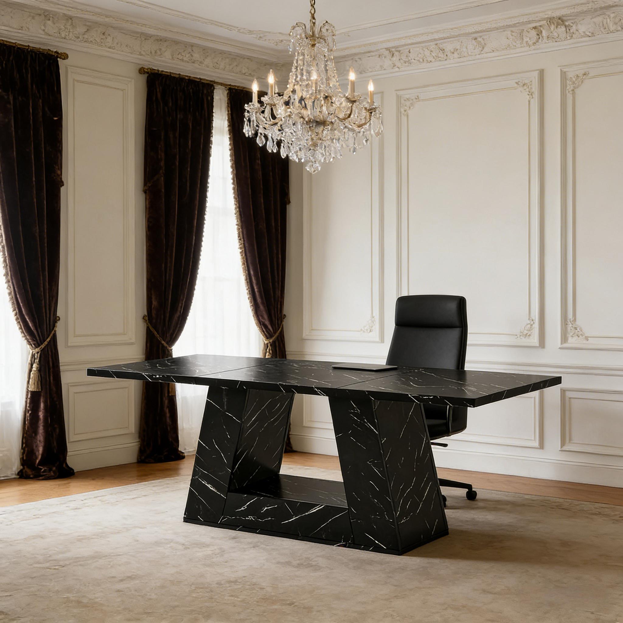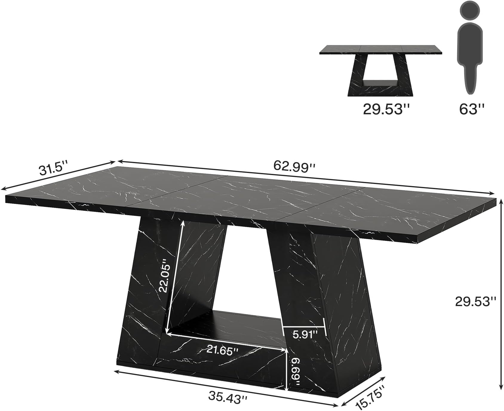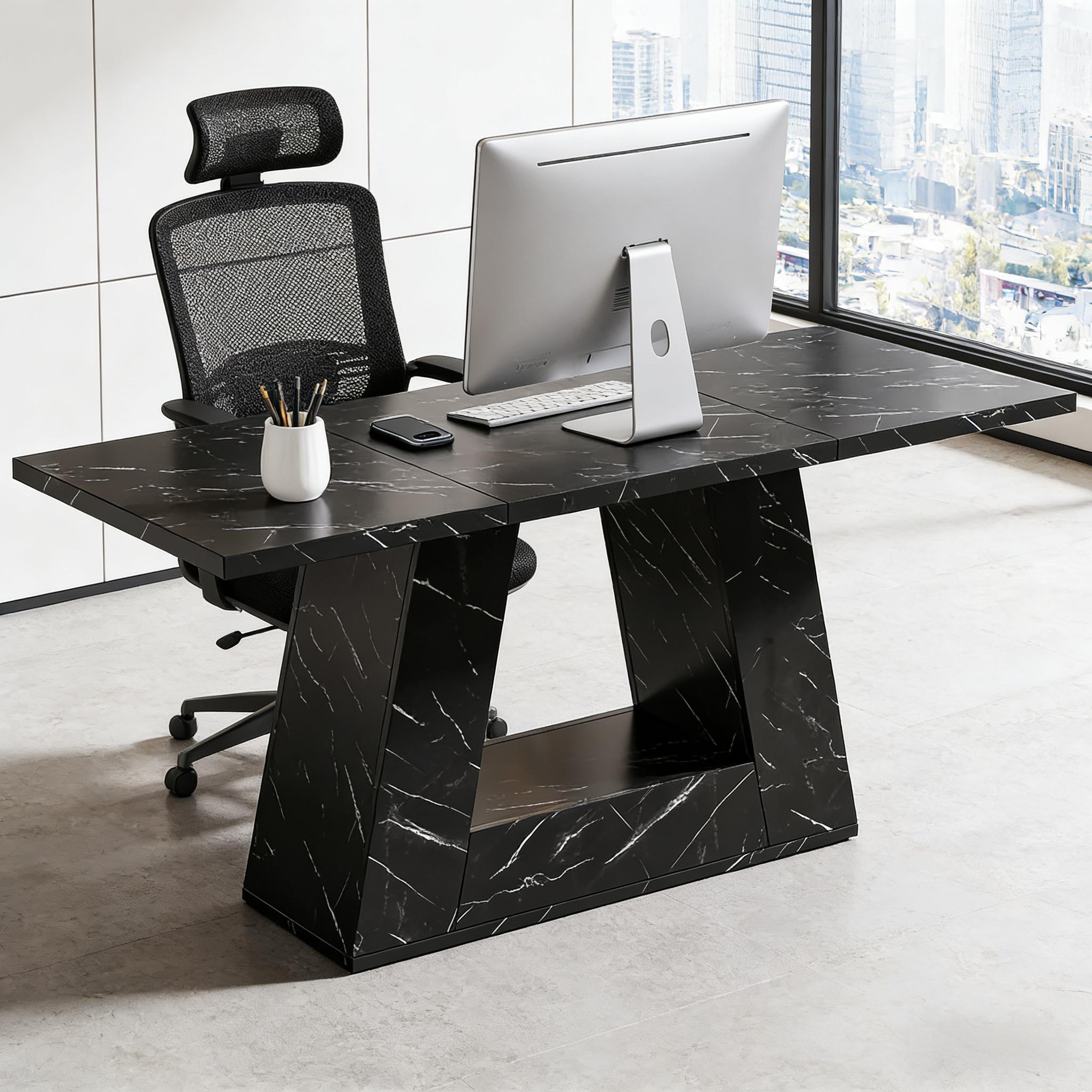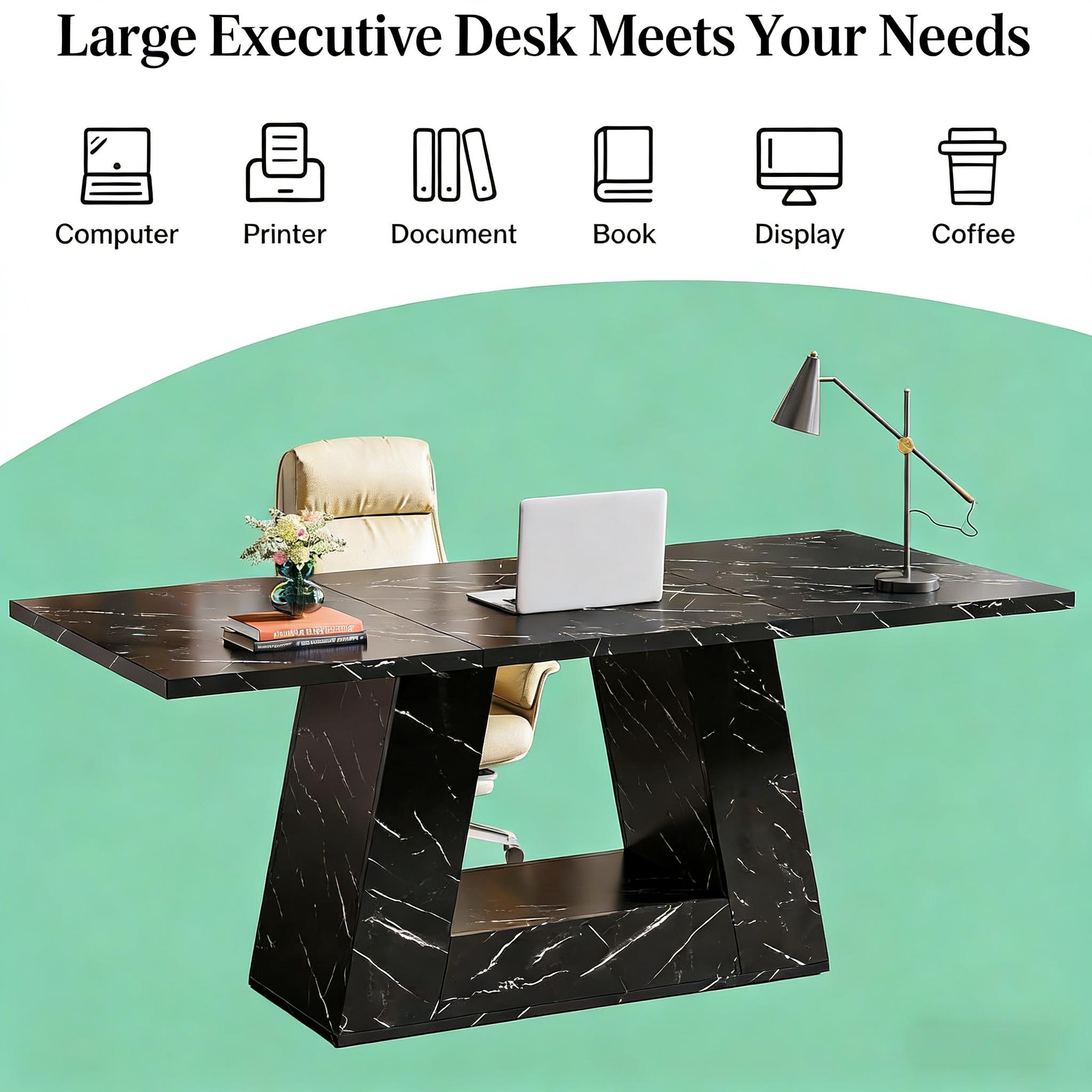 Important Reminder!!! 1) Attention: All products in our store do not support Canada self pickup ordering. Please do not create shipping labels for Canada. Our American products do not support self pickup to Canada 2)We do not ship to Alaska, Hawaii, US protectorates (e.g., Puerto Rico), P.O. boxes, or APO/FPO addresse 3)We don’t accept non-defective remorse returns Spacious Work Area - The office computer desk measures 31.5"D x 63"W x 29.53"H, providing ample space for computers, books, printers, and other office accessories. It's ideal for use in a conference or reception room. Contemporary Design - Add style to your workspace with this large, wooden desk featuring a chic faux marble veneer and unique trapezoidal leg design. Robust Construction - The executive desk is constructed with sturdy materials including a thick 1.18-inch desktop and trapezoidal leg for stability. Versatile Use - This desk doubles as an executive desk, computer desk, conference table or even as a dining table, making it a standout piece of furniture in your home. Hassle-free Assembly - The desk comes with easy-to-follow instructions, pre-numbered parts, and necessary tools. Our dedicated support team is on hand to assist if needed.