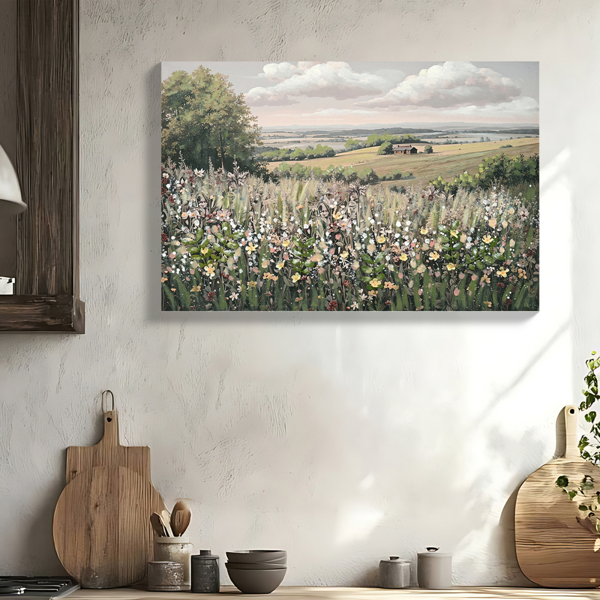 Product Name:Framed Canvas Wall Art Vintage Decor, Landscape Wall Art, Meadow with Flowers Art, Modern Farmhouse Decor, Cottagecore Bedroom Bathroom Office Decorations, 24"x36"