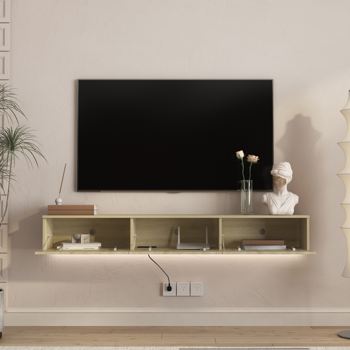 • This wall mounted TV stand has a large storage space, perfect for storing TV components, game accessories, books and decorations. You can also place living room decorations on the TV stand.