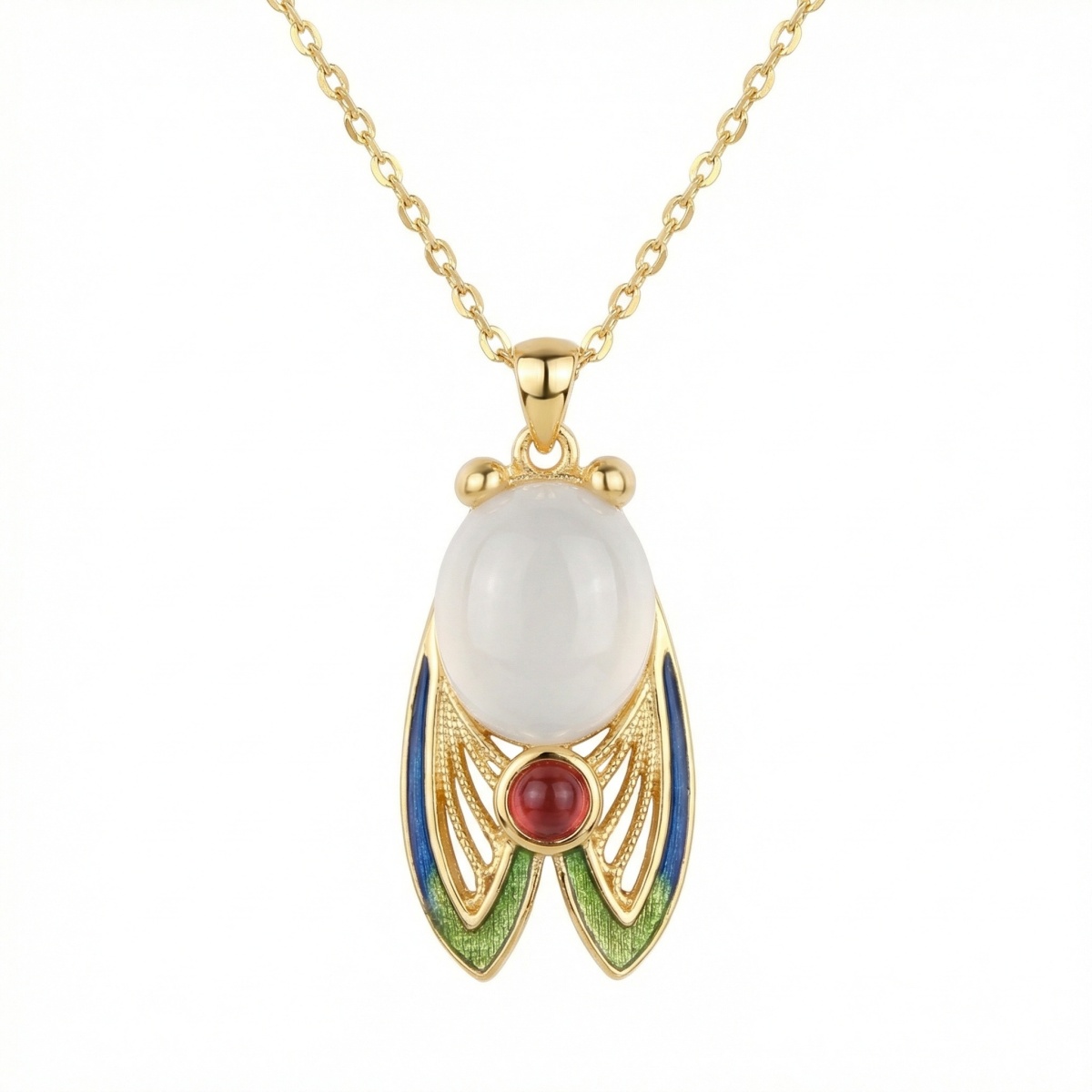 This stunning gold-tone necklace features an intricately designed cicada pendant, blending traditional symbolism with artistic craftsmanship. At its center is a large, smooth, milky-white oval gemstone that forms the cicada's body, complemented by a smaller, vibrant red round stone at the base. The wings are a highlight, showcasing delicate gold filigree work accented with gradients of blue and green enamel for a lifelike, iridescent effect. Two polished gold beads represent the eyes, adding to the charm of this nature-inspired piece. Suspended from a dainty gold-link chain, this necklace serves as a unique statement of elegance and rebirth. | Brand: jewelryodm