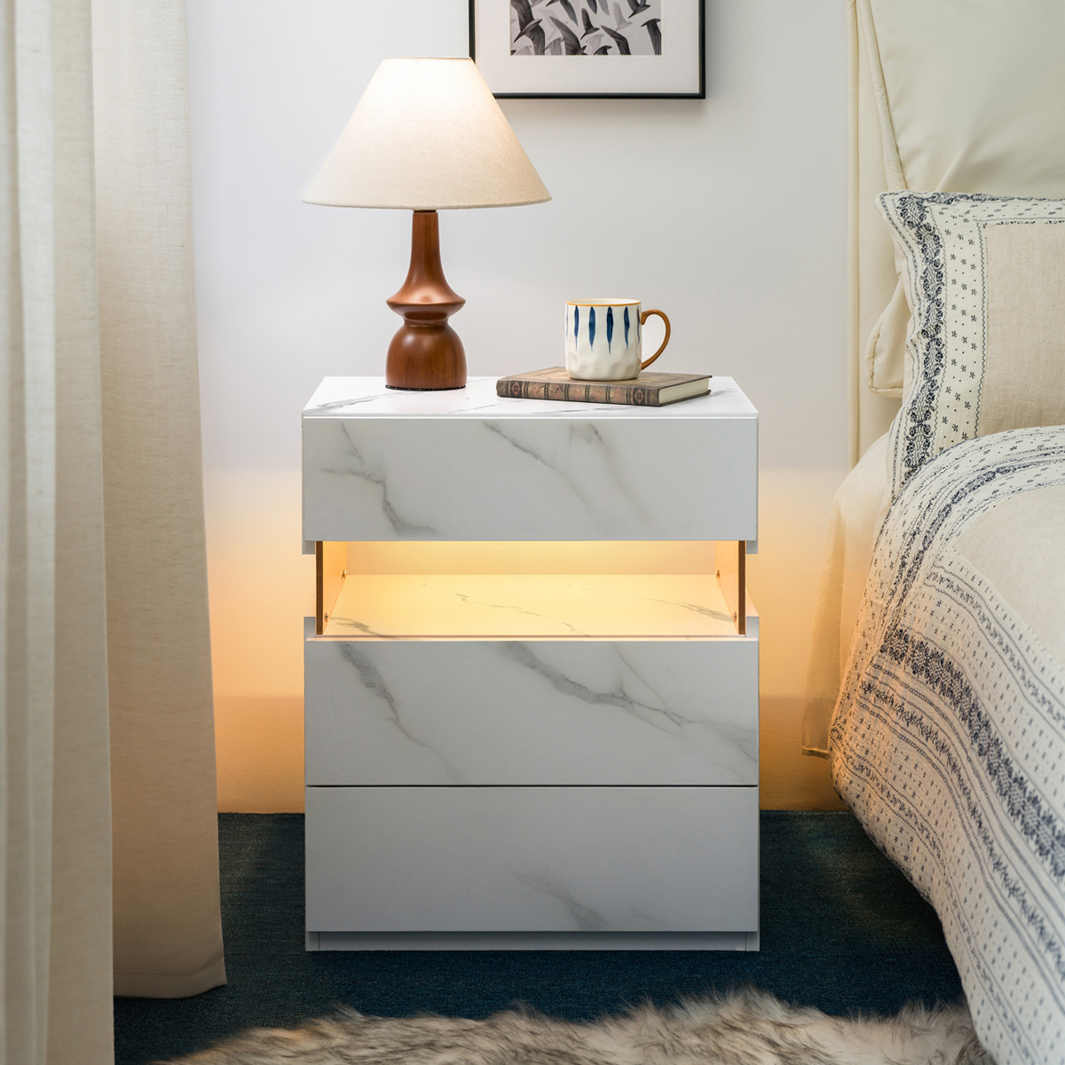 Product Name:LED Nightstands 3 Drawer Dresser for Bedroom End Table with Acrylic Board LED Bedside Tables (White Stone)