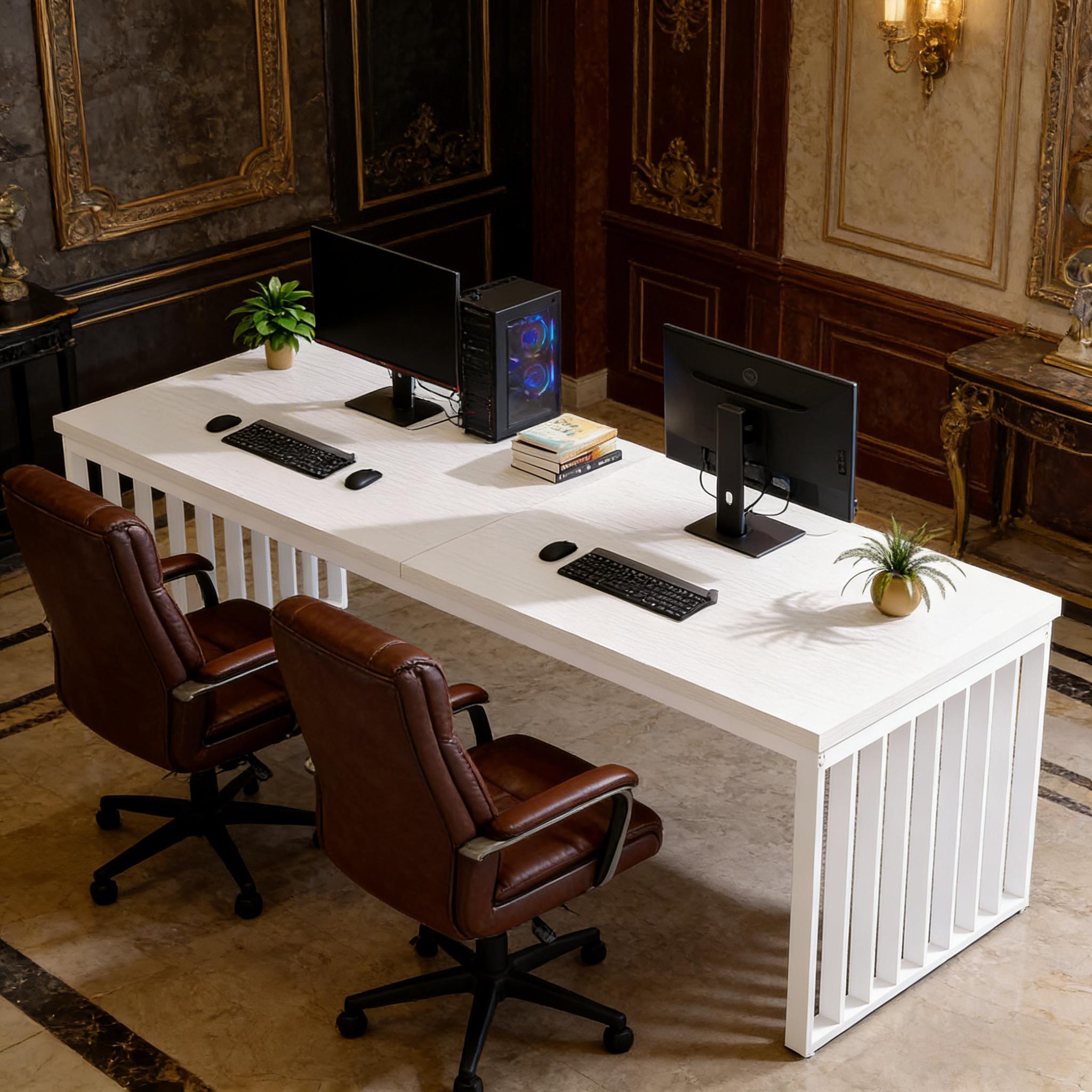 Important Reminder!!! 1) Attention: All products in our store do not support Canada self pickup ordering. Please do not create shipping labels for Canada. Our American products do not support self pickup to Canada 2)We do not ship to Alaska, Hawaii, US protectorates (e.g., Puerto Rico), P.O. boxes, or APO/FPO addresse 3)We don’t accept non-defective remorse returns Sturdy Office Desk - This desk ensures stability and durability with a 0.98-inch thick MDF board tabletop framed with heavy-duty, powder-coated iron tubing. Able to support up to 200 lbs, this desk is built to last. Expansive Workspace - This large, 78.74-inch by 27.56-inch tabletop offers plenty of space for work essentials like laptops, books, and files. Reinforced iron tubing under the tabletop enhances support and stability. Two-Person Desk - Comfortably fitting two computers, this large workstation allows two people to work side-by-side without interruptions. It's perfect for sharing a workspace with roommates or family members. Minimalist Industrial Design - With a simplistic industrial charm, this desk keeps things basic. Adjustable feet padding ensures stability and protects floors from scratches. Please note the wood grain may vary as it's a natural material. Effortless Assembly and Cleaning - This desk comes with all necessary tools and instructions for easy assembly. The surface is also easy to clean - just wipe off any dirt with a damp cloth.