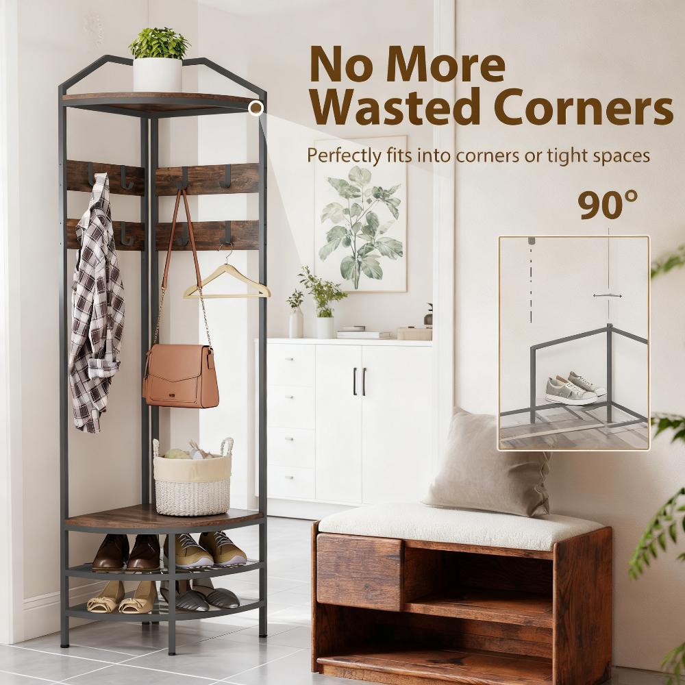 Features: - Eight movable hooks, a two-tier shoe rack, and two storage shelves, keeping your entryway organized - Two-tier shoe rack holds up to four pairs of shoes, fits up to US 10.5 - Its 90° design fits corners perfectly, maximizing space in small apartments - Anti-tipping hardware and adjustable foot pads, ensuring stability and safety - Wood grain and black steel frame add a stylish industrial touch - Assembly required Specification: - Color: Rustic Brown, Black - Material: Particle Board, Steel - Overall Dimension: 17.7" W x 17.7" D x 70.9" H - Top Shelf Size: 17.7" W x 17.7" D - Shoe Rack Layer Height: 8.3"/9.1" - Maximum Shoe Size: US 10.5 - Weight Capacity: 44 lbs. (total), 11 lbs. (per layer) Package Includes: - 1 x Hall Tree - 1 x Manual