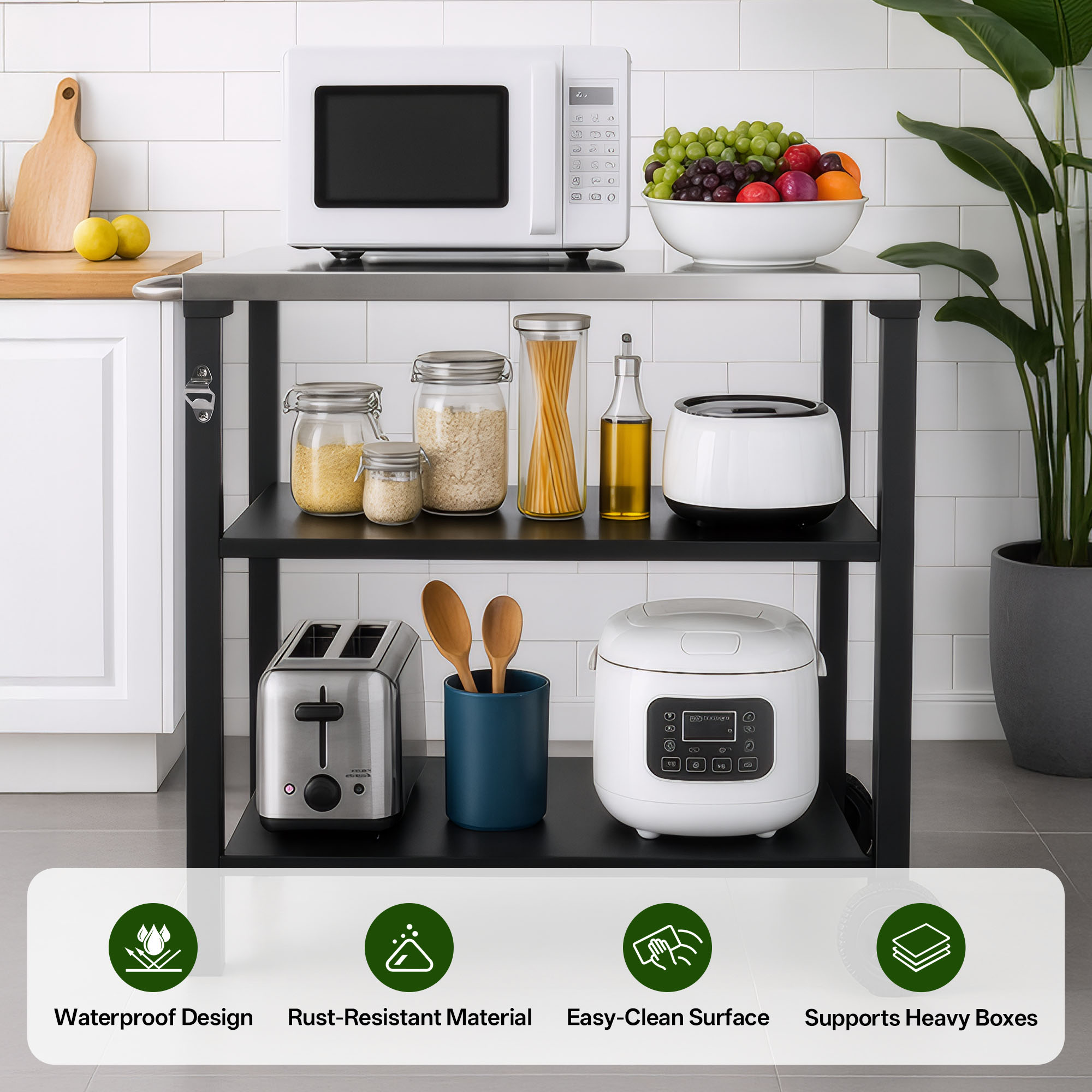 • Easy to Clean & MaintainThe smooth stainless steel top and powder-coated metal shelves are simple to wipe clean with a damp cloth, while the open-shelf design prevents dirt buildup, keeping your cart looking fresh and functional.
