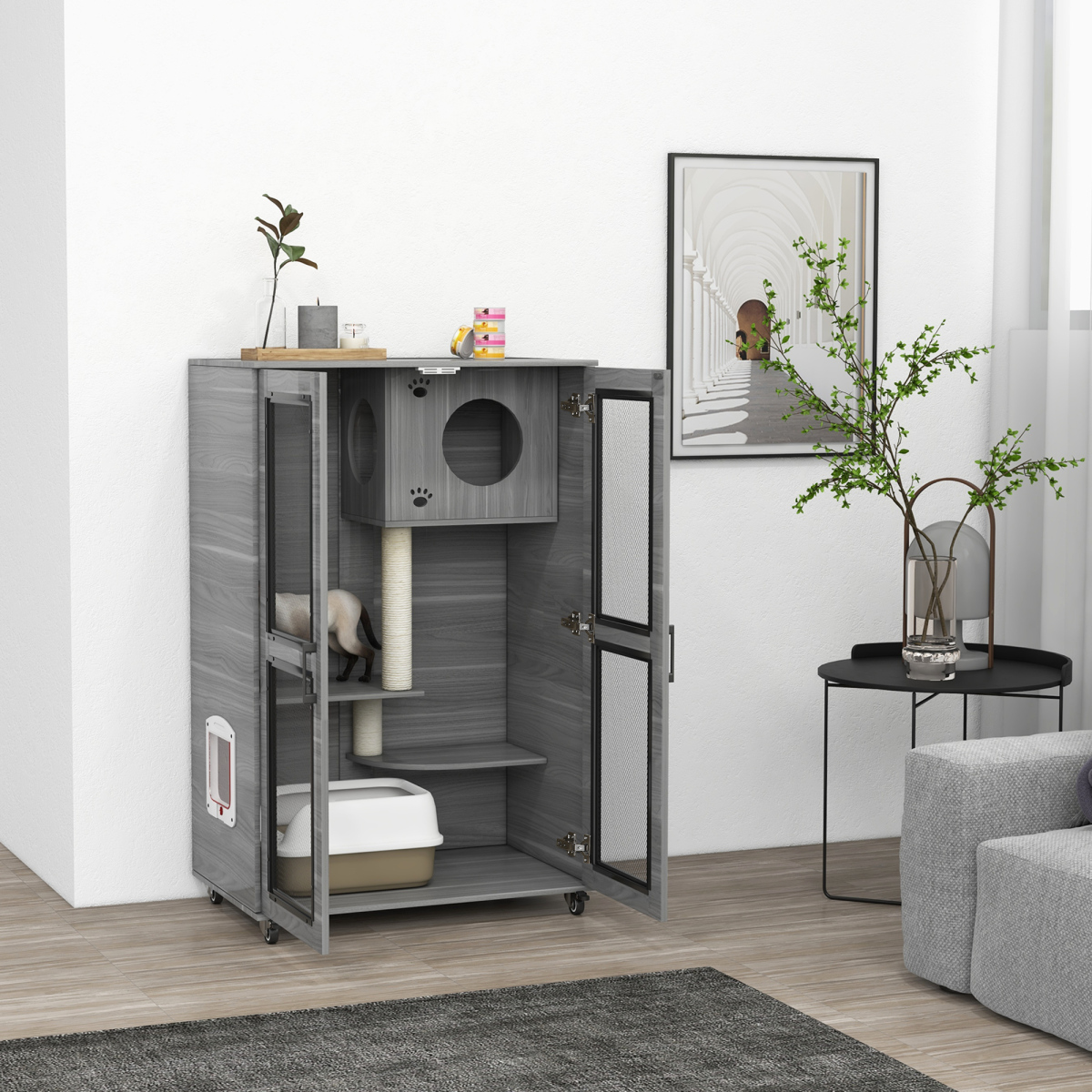 This play and nap space is built with a cabinet design that gives kitties who love to hide a hiding spot inside a hiding spot, and a dark setting to relax and play. Open up the doors to reveal a cat tower with a sleep spot that has the heights feline friends love, where a soft cushion creates a cozy environment. This [BRAND NAME] furniture lets your pet climb, play, scratch, and more, while giving them a cozy, comfy, and happy experience.