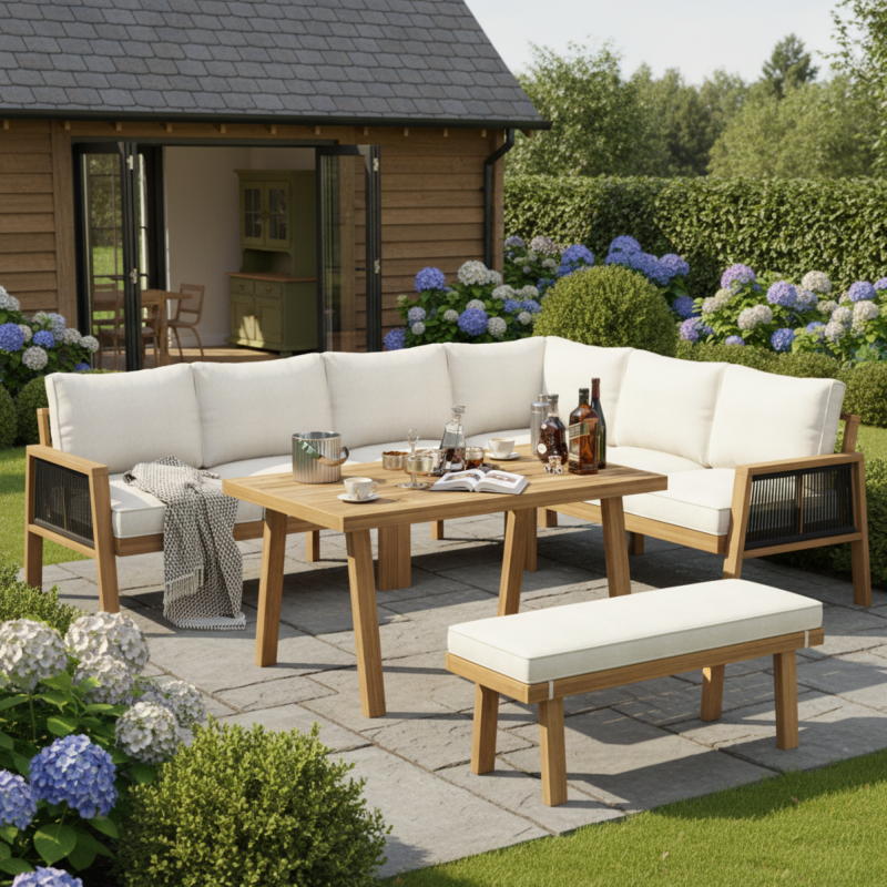 Product Name:6-7 Seater Garden Lounge & Dining Set, Acacia Wood Frame Outdoor Patio Furniture, Corner Sofa + Bench with Rope Braiding, Acacia Wood Tabletop, Includes All Chairs & Backrest Cushions, Natural+ cream