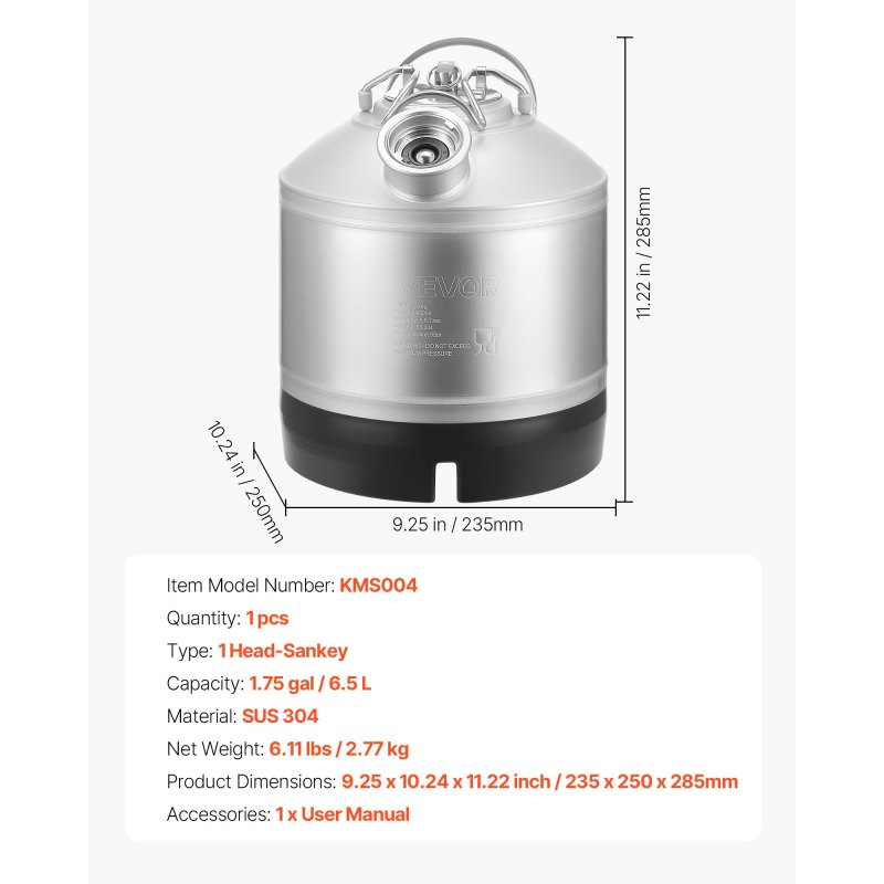 Cleaning Keg, 1.75 Gallon/6.5L Keg Line Cleaning Kit With D Coupler Connection & Rubber Base, Beer Lines Cleaner Used For Beer Line Cleaning, 304Stainless Steel Kegerator Beers Lines Cleaner Kit