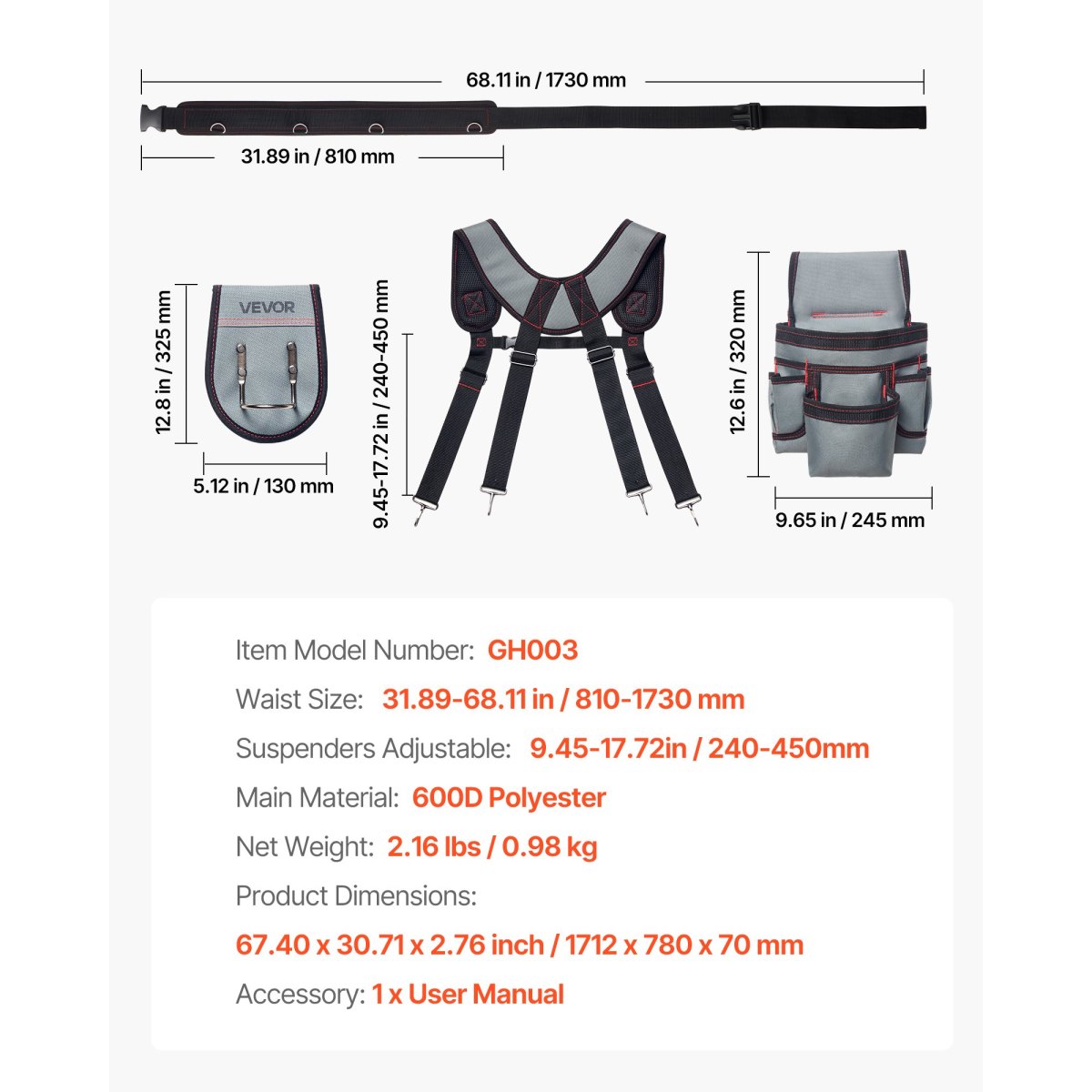 Adjustable Waist: This carpenter tool belt supports 31.89–68.11 in waist adjustment with a durable buckle and sliding adjuster for a comfortable fit. Easily adapts to wearing jackets or workwear, keeping the belt stable while bending, climbing, or moving