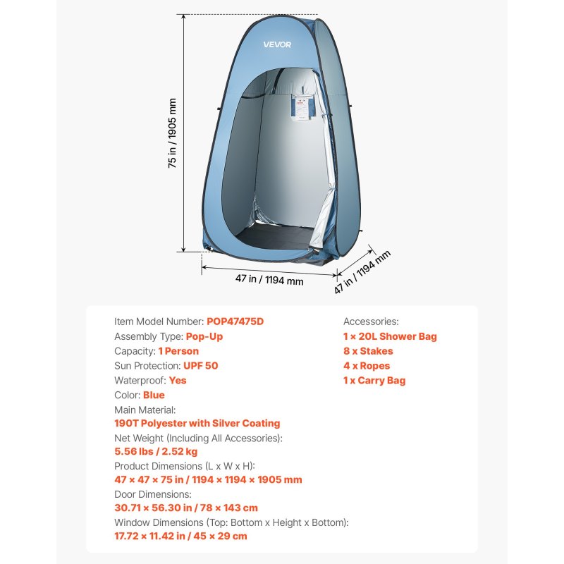 Sun Protection & Water Resistance: Made of 190T polyester with UPF 50 protection, our portable shower tent blocks harsh sunlight. Side windows improve airflow. PU2000mm water resistance lets rain slide off quickly, keeping the interior dry