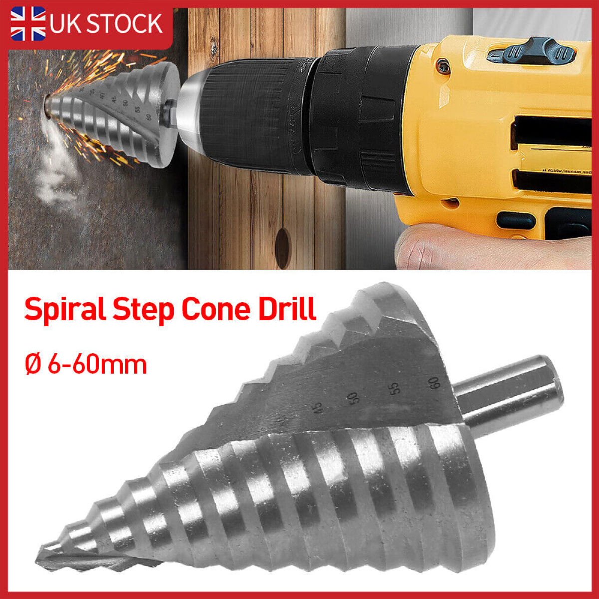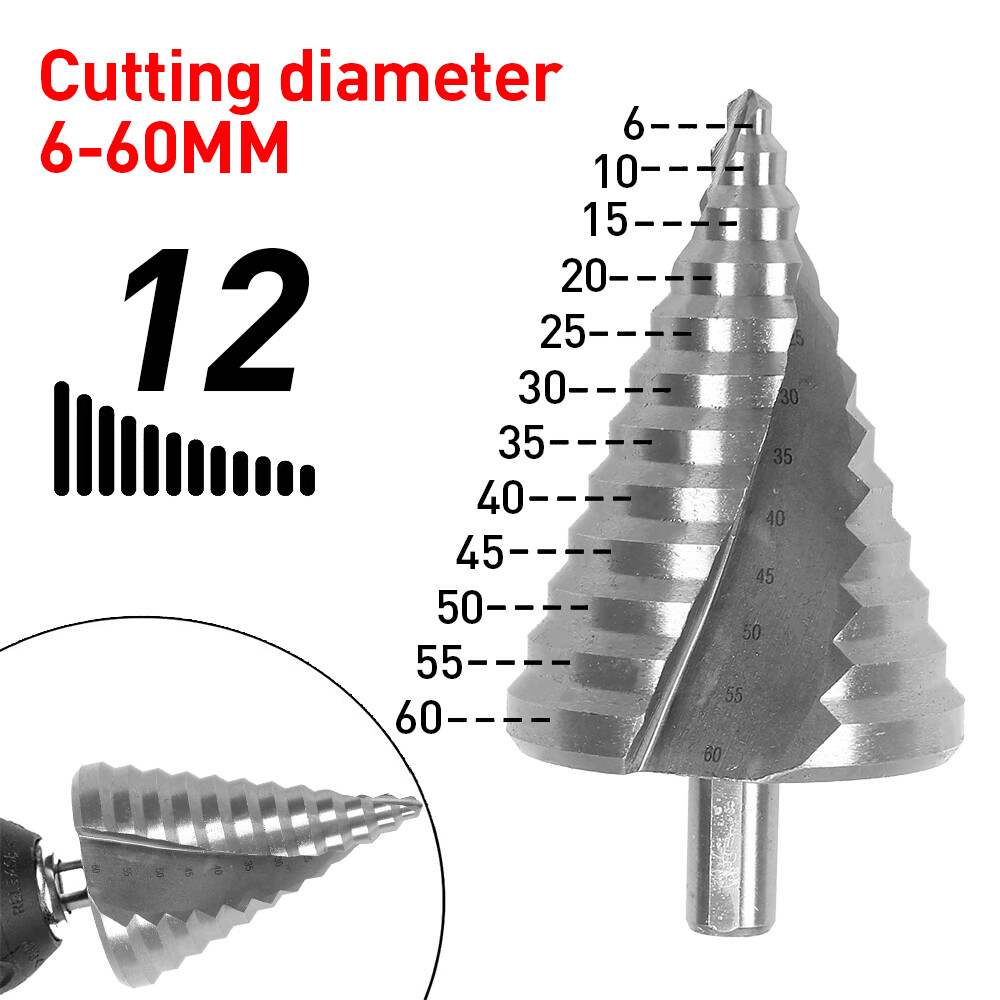 The stepped drill bit build in 12 steps drilling size(6mm, 10mm, 15mm, 20mm, 25mm, 30mm, 35mm, 40mm, 45mm, 50mm, 55mm, 60mm). One-time enlarger holes, no need to replace the drill bit and positioning hole during using.