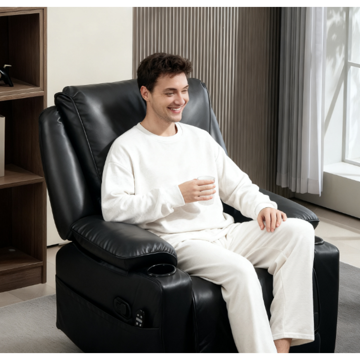 Features: - Eight vibrating massage points effectively soothe tired muscles - Five massage modes with lumbar heating, controlled by a remote for enhanced relaxation - Side tab allows upright or 150 degrees reclining positions - Rocking and 360-degree swivel for versatile comfort - Oversized design with thick cushions offers extra comfort - Overstuffed seat with spring pocket for stretchy comfort - Two side pockets and two cup holders increase functionality Easy to assemble. Specification: - Color: Black - Materials: PU (100% Polyurethane), Foam, Steel - Upright Dimension: 33.5" W x 39" D x 40.6" H - Reclined Dimension: 33.5" W x 63.8" D x 32.3" H - Seat Size: 22" W x 20.5" D x 19.3" H - Back Size: 26.8" L x 32.3" W x 9.8" D - Armrest Size: 29.1" L x 9.8" W x 5.9" H - Pocket Size: 29.1" W x 11.4" H - Power Cord Length: 5.9' - Cup Holder Size: 4.3" Dia. x 2.6" D - Input: 100-240V 50/60Hz - Output: 12V, 1A, 12W - Weight Capacity: 298 lbs. Package Includes: - 1 x Massage Recliner Chair - 1 x Remote - 1 x Manual