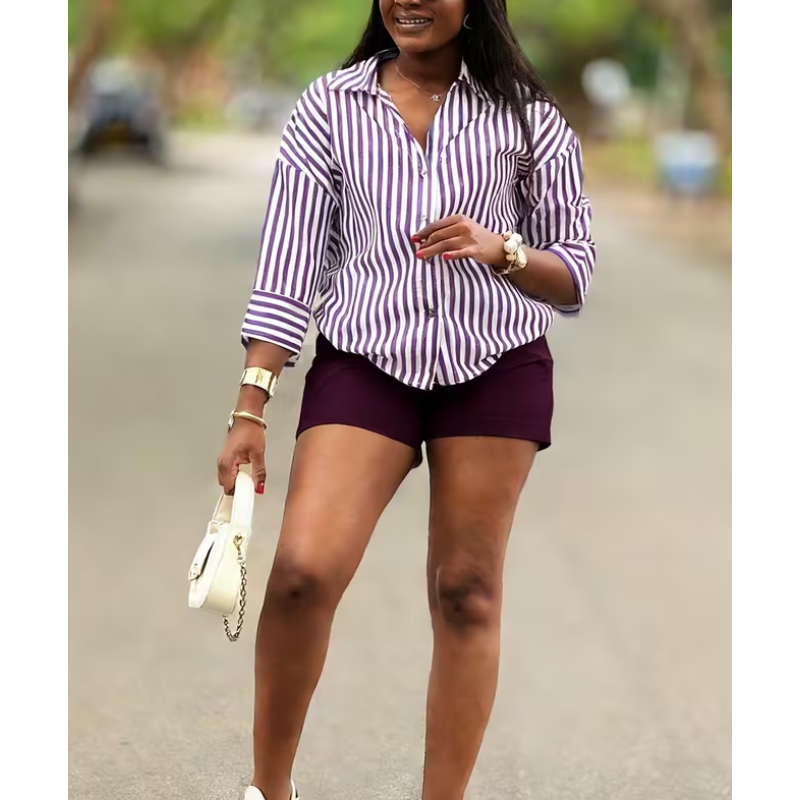 Vintage Striped Loose-fit Shirt Style: American Vintage / Commuting Casual / Oversized Flattering Collar Collar Type: Lapel (with Open V-neck) Cut: Loose-fit with Dropped Shoulders, Relaxed and Casual Seasonality: Spring, Summer, Fall (Can be worn throughout the year, with the highest compatibility in spring and autumn)