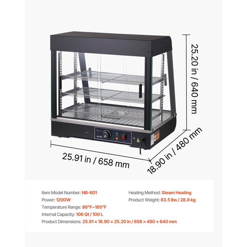 Transparent Design with LED Lighting: This countertop food warmer features thick tempered glass to retain heat while clearly showcasing your products, and the built-in LED warm light makes food look more appealing to attract customers