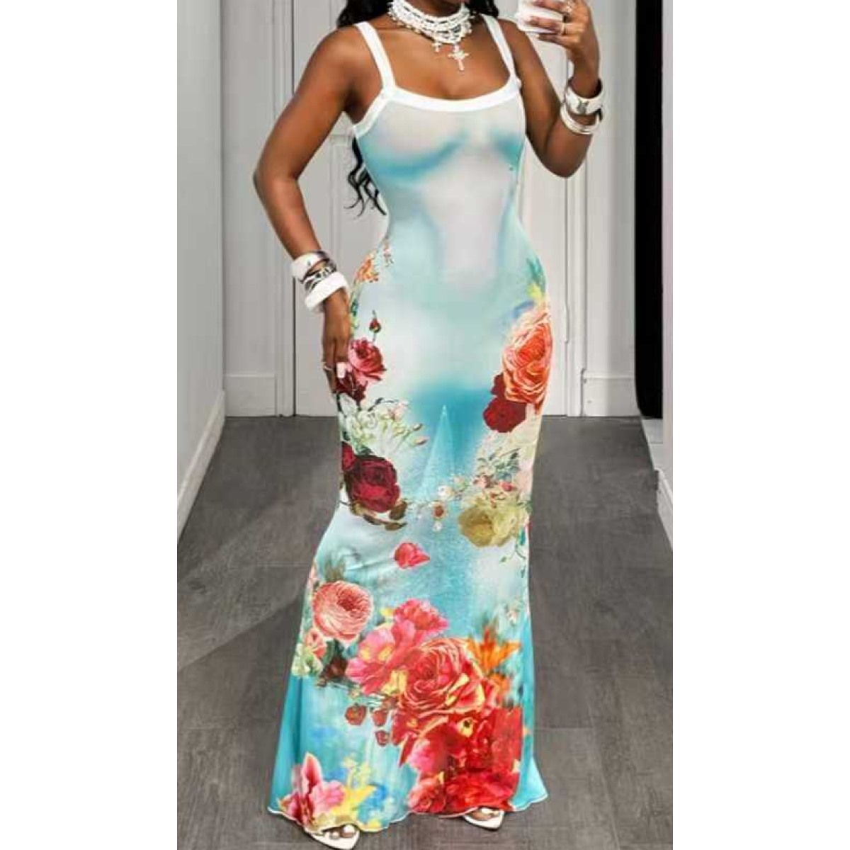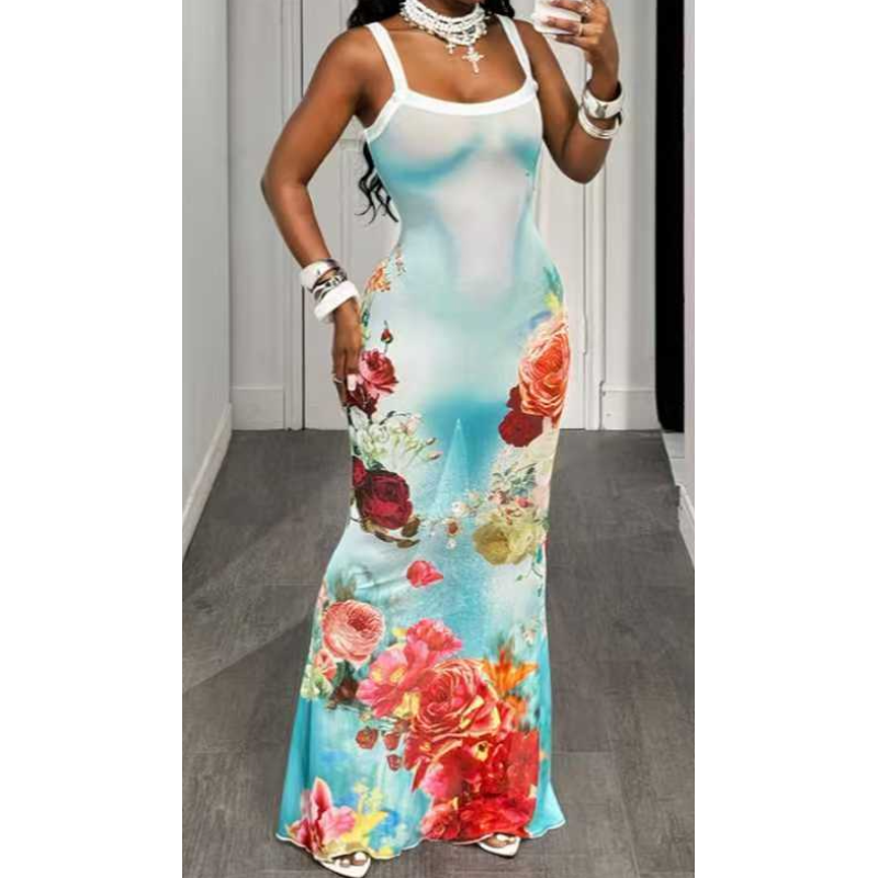 Style: Vacation/Casual / Mature & Sexy Neckline: Square Neck (Shower Strap Design) Sleeves: Sleeveless Fit: Slim-fit Mermaid Maxi Dress Suitable Seasons: Summer, Early Autumn Design: Contrasting trim on the dress straps and a slim-fit mermaid skirt create a romantic, retro look that flatters the figure. Suitable Occasions: Vacation, Beach Photos, Dating, Evening Outfits, Street Style, etc.
