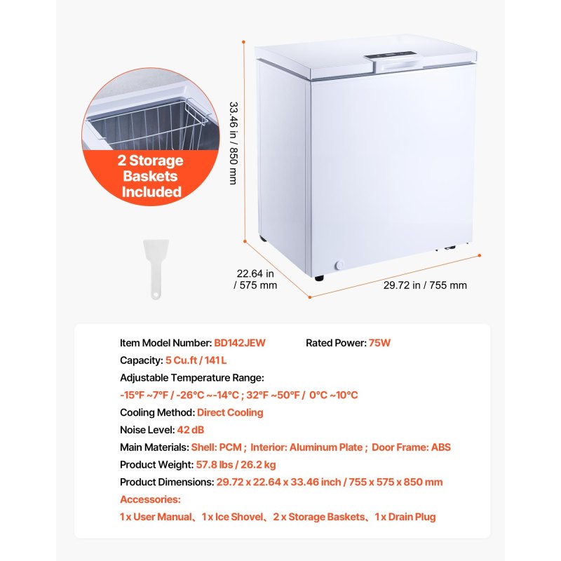 5 Cu.ft Capacity with 2 Baskets: VEVOR chest freezer features a 5 cu.ft / 141 L large capacity and 2 baskets for organized food storage and quick access, maintaining consistent freezing conditions to keep food fresher for longer. Also provide a shovel for convenient defrosting