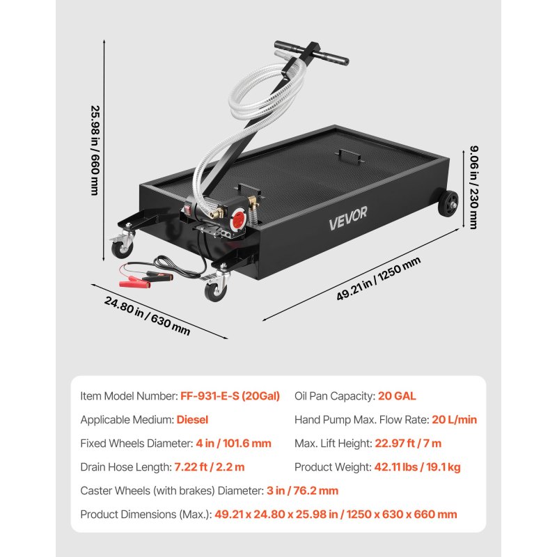 Low Profile Oil Drain Pan, 20 Gallon Capacity, Rolling Oil Drain Pan With Electric Pump & 7.2 Ft Hose, Leak-proof & Corrosion-resistant, Fit For Cars, SUVs, Trucks, Motorcycles, ATVs, Metal