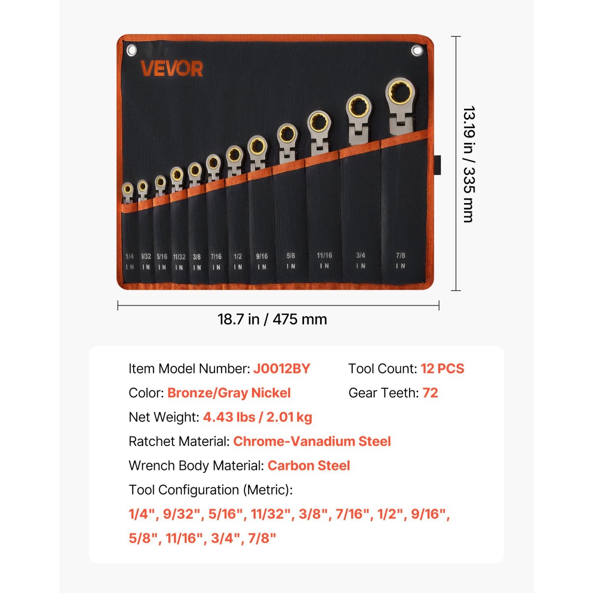 Flex-Head Ratcheting Wrench Set, 12-Piece SAE Sizes, 72 Teeth, Cr-V Steel Ratchet Flexible Combination Wrench Set With Roll Up Pouch, For General Household And Automotive Repairs, Gray Nickel