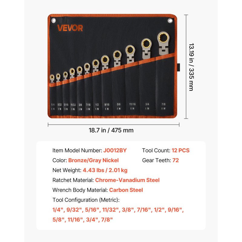 Complete Size Range for Daily Repairs: Our SAE flex head ratcheting wrench set includes 1/4, 9/32, 5/16, 11/32, 3/8, 7/16, 1/2, 9/16, 5/8, 11/16, 3/4, and 7/8 in—ideal for automotive work, home maintenance, machinery assembly, and DIY projects