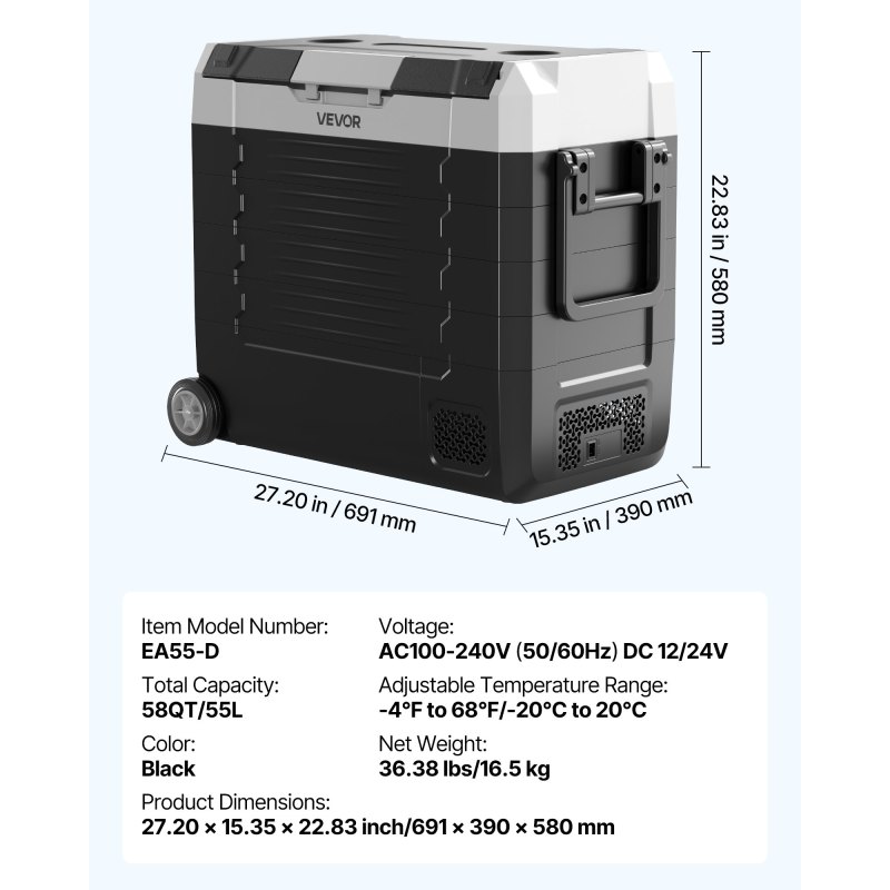 Dual-Power Flexibility: Supporting 12/24V DC and 110–240V AC, the car cooler for vehicle adapts to vehicle or household power needs. Its compact build suits RVs, cars, trucks, and vans, and smooth-rolling wheels paired with a strong handle allow effortless movement wherever you go
