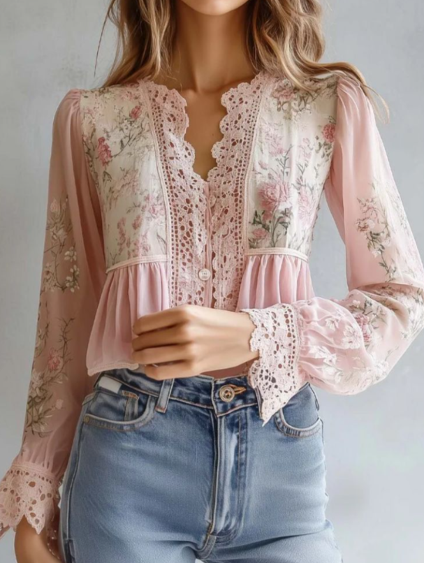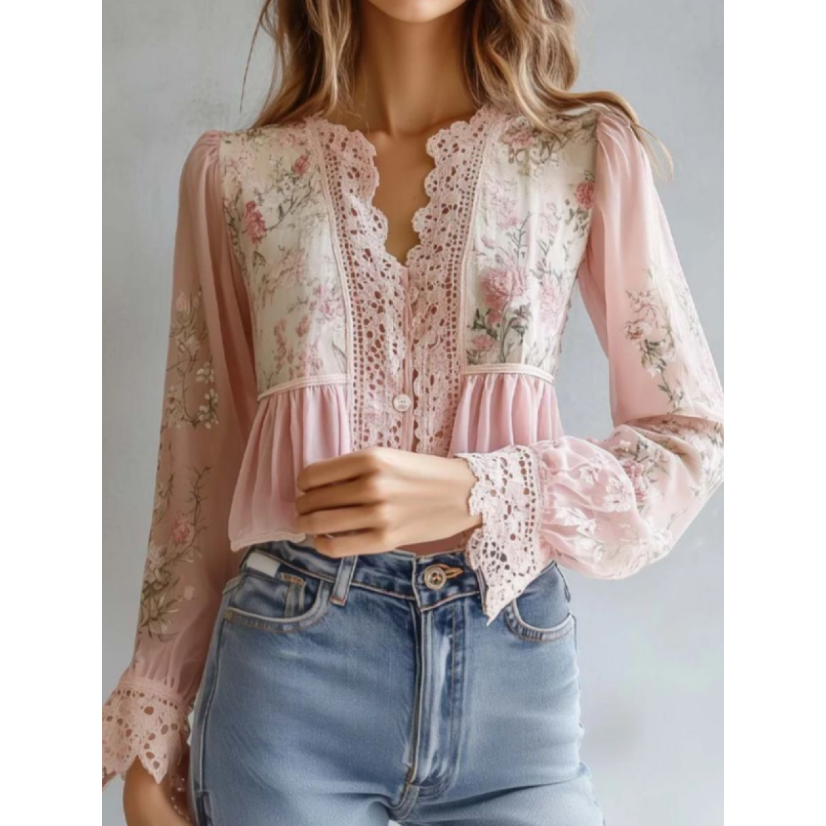 Design: Floral print, lace-trimmed V-neck, puff sleeves, fitted waist