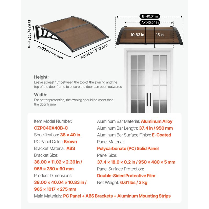 Quick DIY Installation: This exterior door canopy comes with a complete accessory kit, clear installation instructions, and two types of mounting screws for brick, concrete, or wooden walls. Easy for one-person DIY installation. Measure your space for an ideal fit