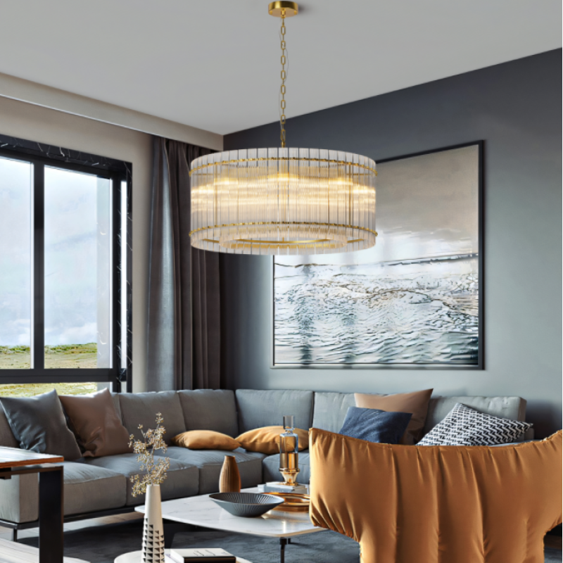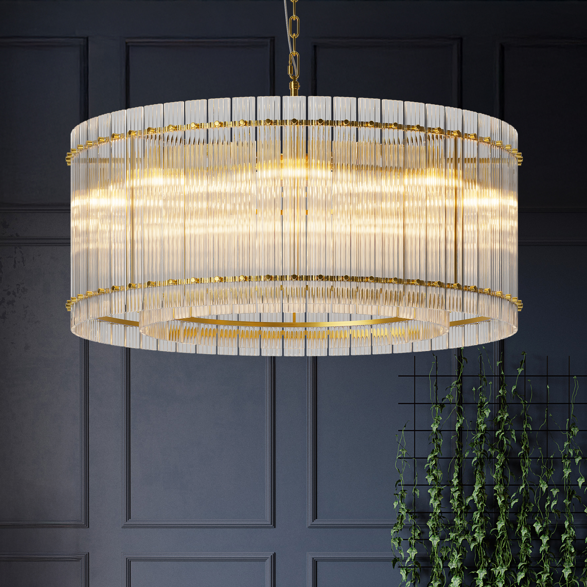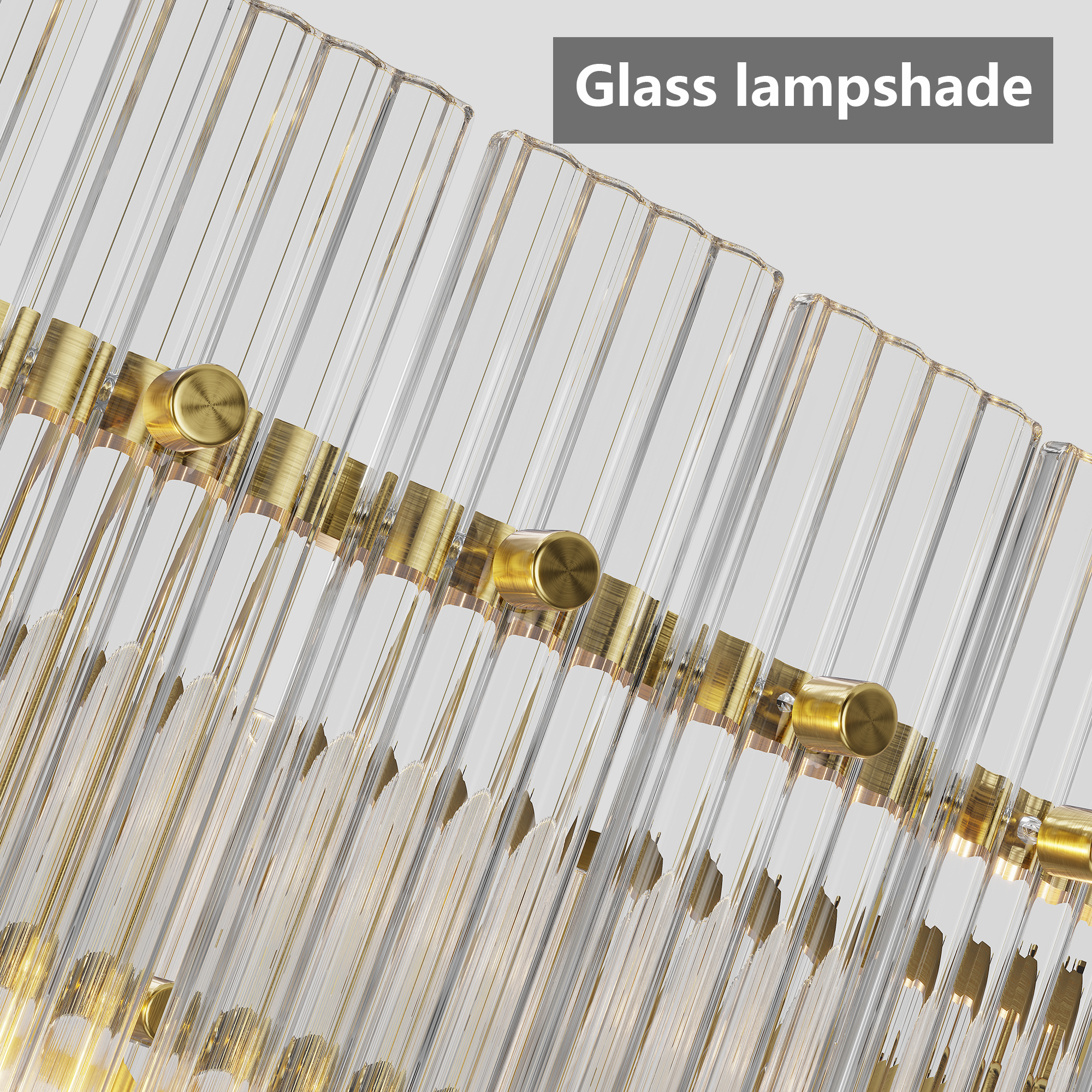 Unique Water Wave Design:This gorgeous chandelier features handmade corrugated glass.Each piece of glass is unique.Infuse your space with dazzling light.Matte gold coated metal frame can be used for a variety of occasions.Round Chandelier Size Weight:Unique double-tiered round chandelier measures 37 inches in diameter and 15.7 inches in height. Comes with a 71-inch hanging chain, and its hanging height can be adjusted according to the length of the chain!Upgrade Materials: The chandelier are made of materials and workmanship that are well above industry standards, and the details of the chandelier include a large number of handmade, just for the sake of the elegance and beauty of your home!External thickened cardboard box, the internal use of high-quality pearl cotton protective film, enough to withstand the long-distance transportation process of rough handling and bumping to ensure that the chandelier is 100% intact.Applicable Space:Metal chain link chandelier can be installed on the sloping ceiling, the chandelier is suitable for dining room, kitchen, living room, dining table,hotel, bedroom, office,foyer entryway,meeting room and so on.Also our chandeliers are perfect for high ceiling spaces!