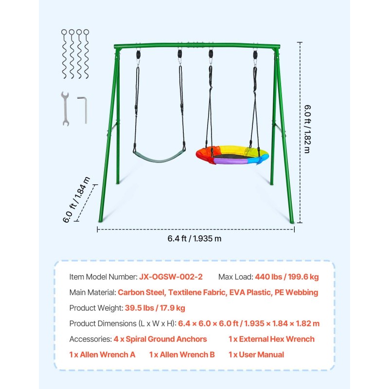 Sturdy Structure: This A-frame swing set for backyard supports up to 440 lbs/199.6 kg. The steel A-shaped frame forms a stable triangular base and can be secured to the ground with included spiral ground anchors for steady use during swinging