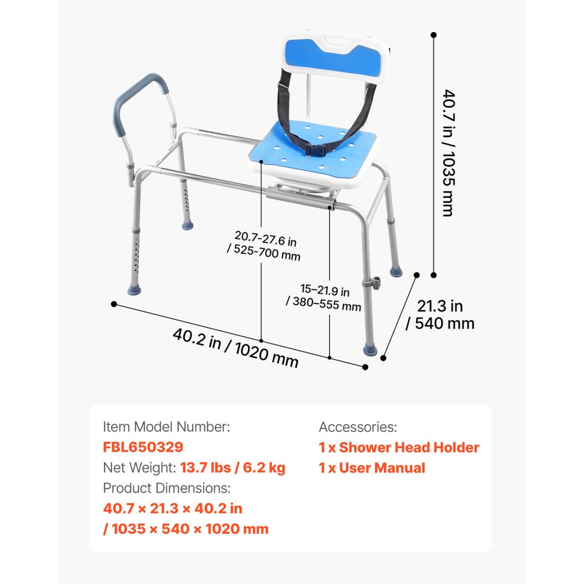 Adjustable Height: Our tub transfer bench provides 15-level push-button height adjustment. Seat-to-floor height ranges from 15" to 21.9" (380–555 mm), suitable for different user heights and bathtubs. Not for tubs over 21.9" (555 mm) or claw-foot tubs