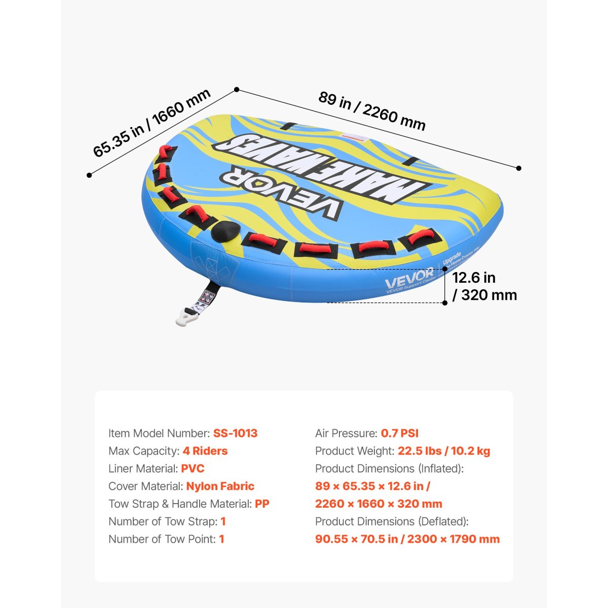Thrilling & Secure Riding: VEVOR towable tube for boating features stabilizing fins for added stability, helping keep you from being thrown off by waves. And the streamlined D-shaped design minimizes water resistance, allowing you to enjoy smoother rides