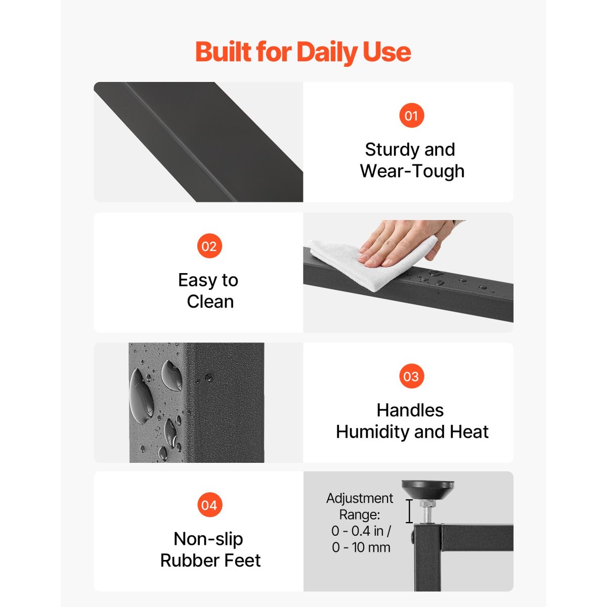 Engineered for Durability: Constructed from high-strength carbon steel, each table leg features a powder-coated surface that resists fingerprints and cleans easily. Features 0-0.4 in / 0-10 mm adjustable leveling feet to help you easily level the table