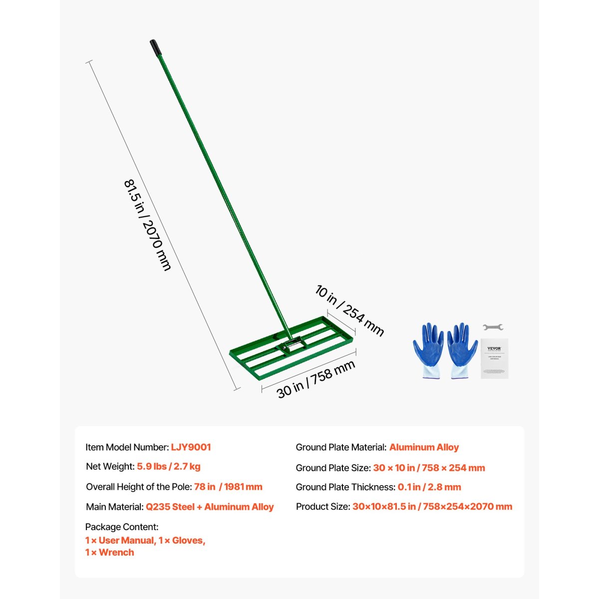 Large-Sized Lawn Leveling Rake: VEVOR's level lawn tool with a 30x10 inch ground plate, swiftly and effectively levels the ground, saving time and effort. Suitable for various terrains like lawns, farms, gardens, and golf courses for leveling sand, soil, compost, and moss.