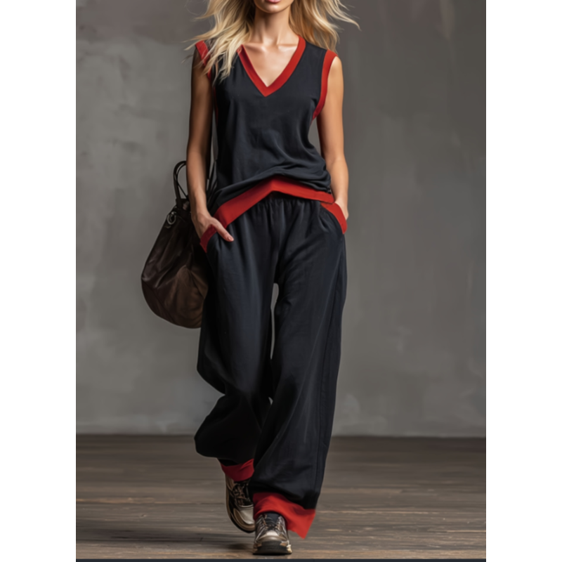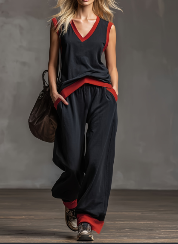 Meihuan color collision visual impact: Classic black and red color collision design, V-neck, hem, and pants with red edging to create a strong visual hierarchy, with a cool and spicy girl atmosphere