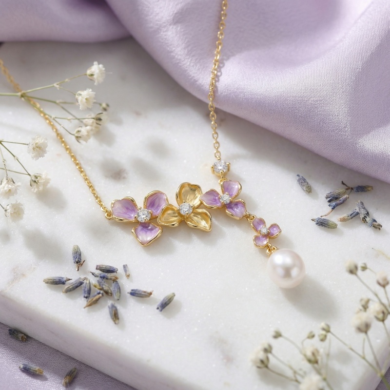 This exquisite necklace features a delicate botanical design, showcasing a cascade of hand-enameled purple flowers paired with a lustrous metallic bloom. Each floral center is adorned with a brilliant, sparkling stone that catches the light beautifully. The design is finished with a graceful, teardrop-shaped white pearl drop that adds a touch of classic sophistication. The fine chain complements the intricate pendant, making it a perfect accessory for special occasions or to add a romantic flair to your everyday attire. Crafted with meticulous attention to detail, this piece captures the essence of a spring garden in bloom, offering a timeless and feminine aesthetic for any jewelry collection. | Brand: jewelryodm