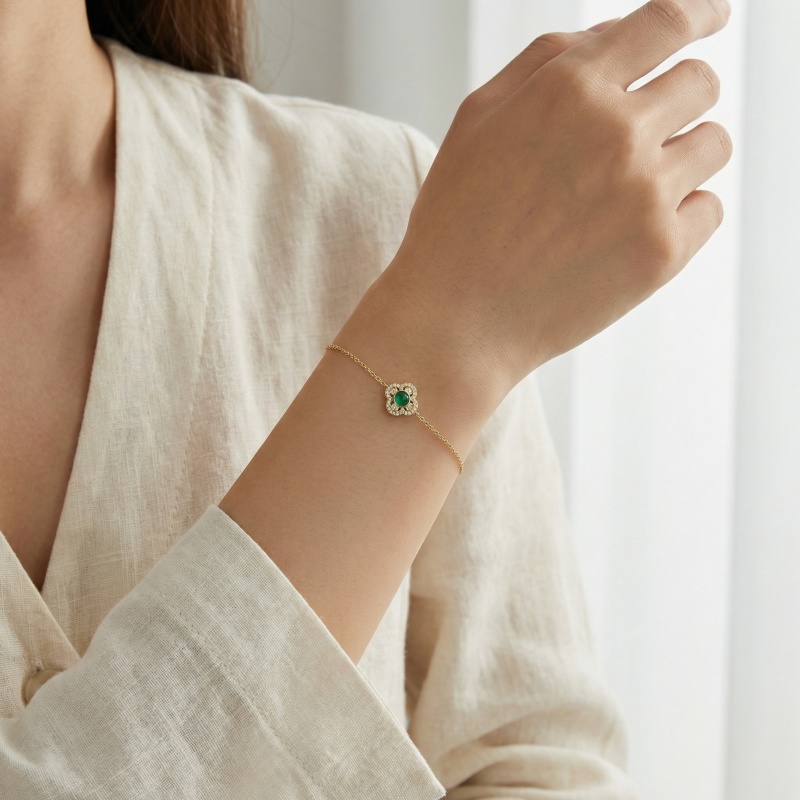 This exquisite piece features a vibrant green cabochon center, elegantly framed by a four-leaf clover design. The central motif is beautifully embellished with shimmering baguette and round-cut clear stones that capture and reflect light brilliantly. Crafted with high-quality sterling silver and featuring a lustrous warm-toned finish, this accessory offers a sophisticated aesthetic for any occasion. The delicate link chain includes a single bezel-set brilliant stone and an adjustable extender to ensure a perfect fit, secured by a reliable spring ring clasp. Perfect for gifting or personal wear, this timeless piece adds a touch of classic charm and nature-inspired beauty to your jewelry collection. Its refined design makes it a versatile choice for both casual elegance and formal events. | Brand: jewelryodm