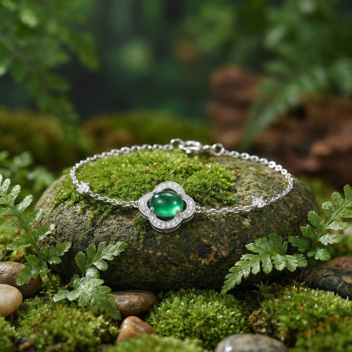 This exquisite bracelet is crafted from high-quality S925 sterling silver, ensuring both durability and a brilliant shine. At its heart lies a stunning oval-shaped green gemstone with a smooth cabochon finish, encased in a delicate clover-inspired frame embellished with shimmering cubic zirconia. The slender silver chain is further accented by two small clear stones on either side, adding a touch of balanced elegance. Designed for versatility, the bracelet features an adjustable extender chain and a secure clasp, allowing for a comfortable and customized fit. Whether given as a thoughtful gift or worn as a sophisticated personal accessory, this piece radiates timeless charm and refined style. Its minimalist yet luxurious aesthetic makes it the perfect choice for enhancing any outfit, from casual daywear to formal evening attire. | Brand: jewelryodm