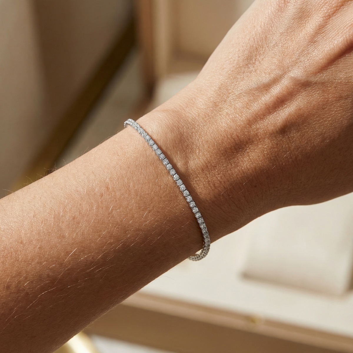 This elegant tennis bracelet showcases a seamless line of brilliant round-cut stones, each held in a delicate silver-tone setting to capture and reflect light from every angle. The classic design offers a refined aesthetic, perfect for adding a touch of glamour to any ensemble, from professional attire to elegant evening gowns. Crafted with precision, the bracelet features a sturdy spring ring clasp that provides both security and ease of wear. The minimalist yet luxurious appearance makes it an ideal gift for anniversaries, birthdays, or special celebrations. Its timeless appeal ensures it remains a staple in any jewelry box, offering a sophisticated sparkle that never goes out of style. Durable and radiant, this piece is designed for those who appreciate understated elegance and high-quality craftsmanship. | Brand: jewelryodm